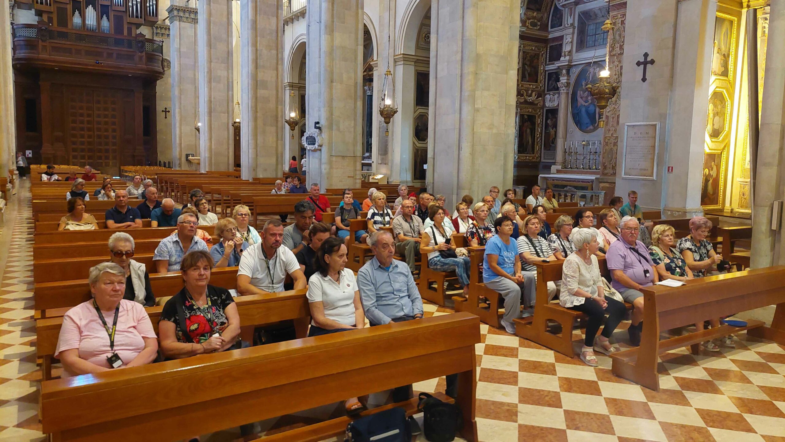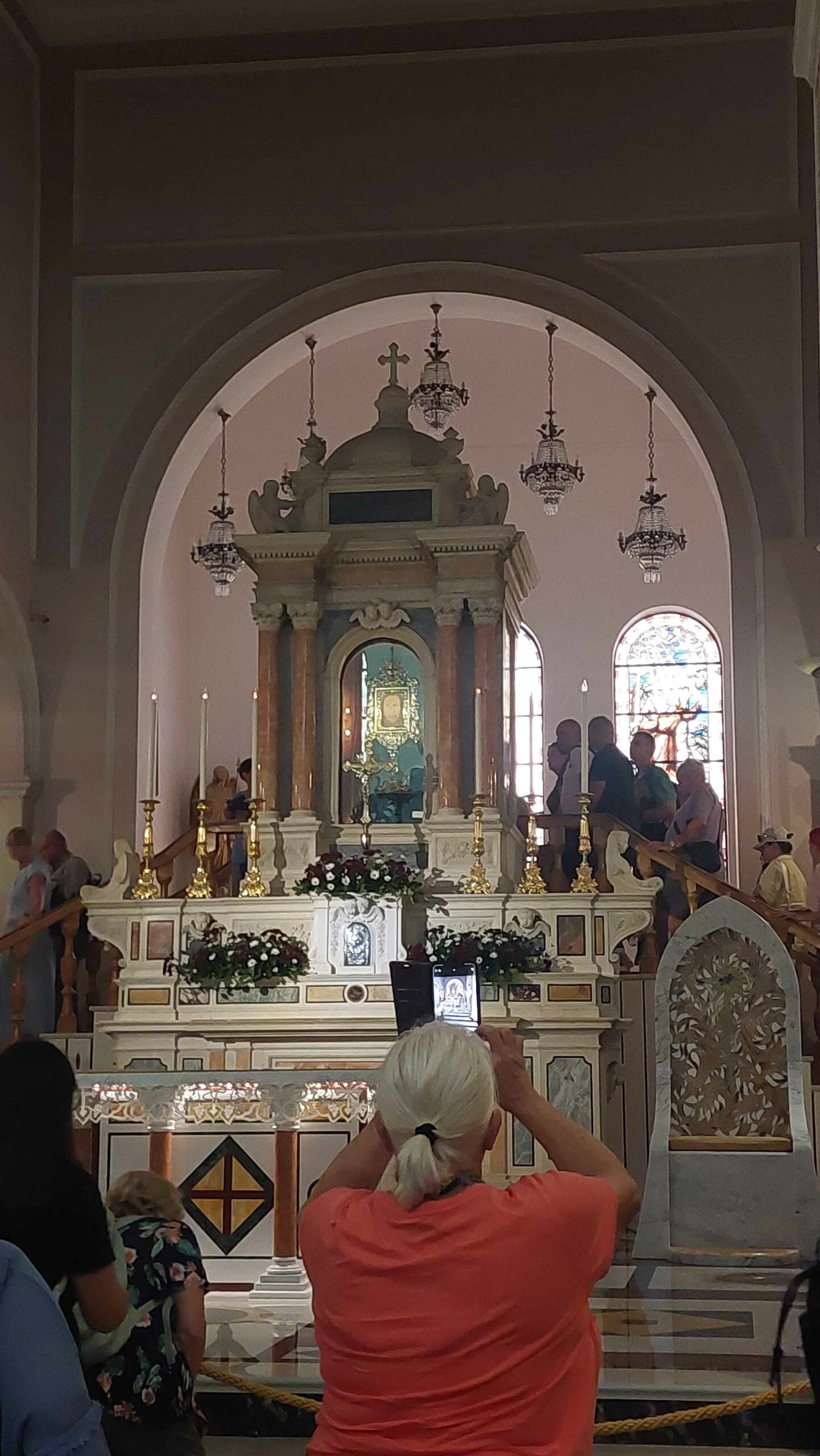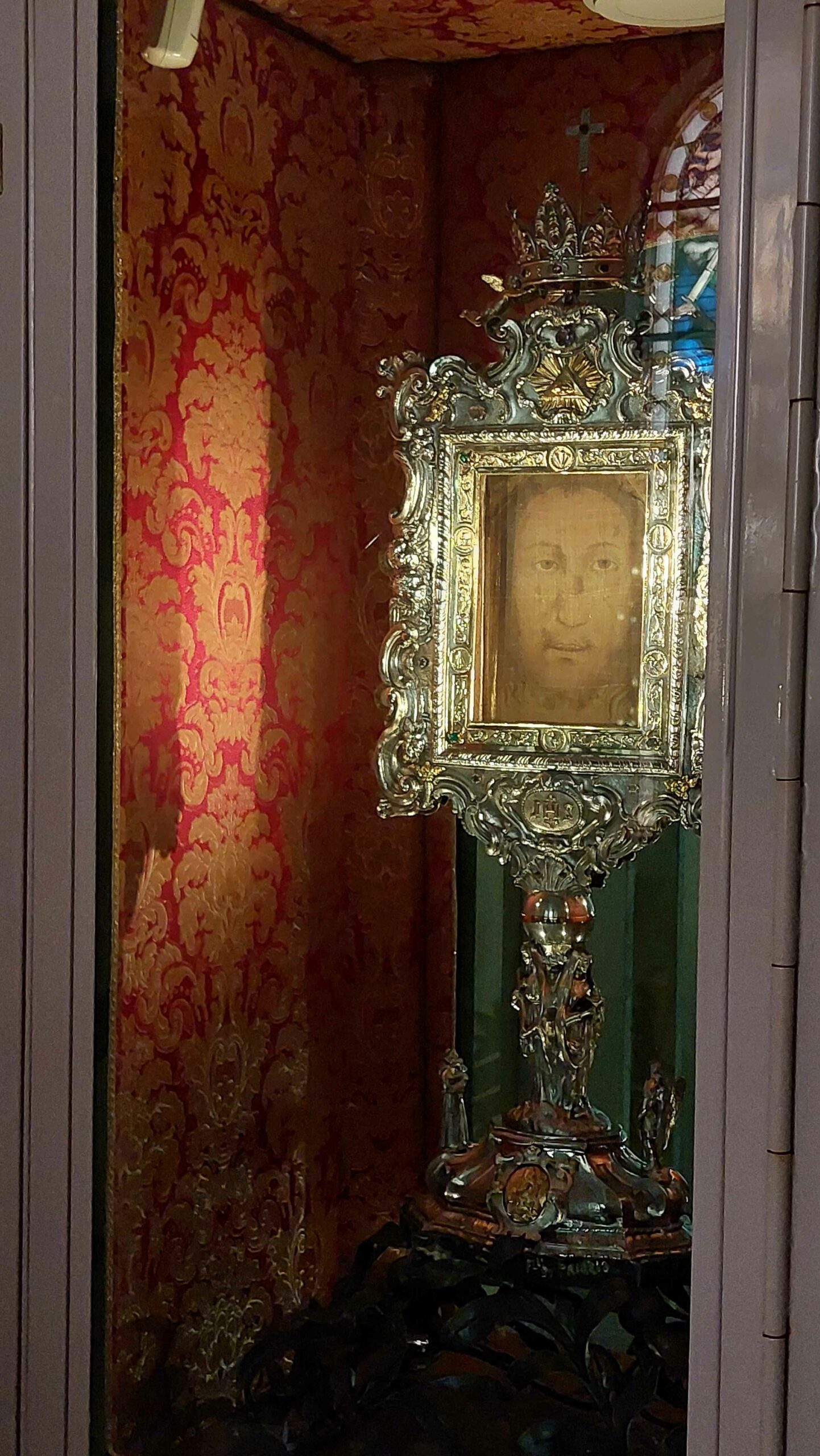 Kościół franciszkanów, w tym maleńkim miasteczku kryje się tkanina z bisioru, na której widnieje oblicze Chrystusa Zmartwychwstałego, nie ręką ludzką uczynione. Przed nim dziękowaliśmy Bogu za to pełne miłości miłosiernej spojrzenie Zbawiciela. On nie patrzy, by nas przyłapać na złu, ale uratować i poprowadzić przez życie. Śpiewając i trwając w ciszy na modlitwie, czuliśmy delikatność tego spojrzenia.