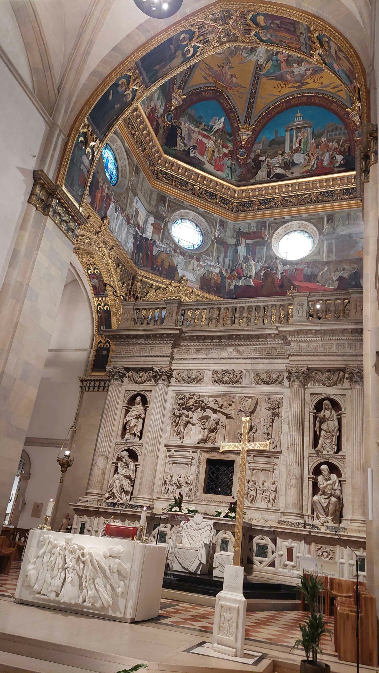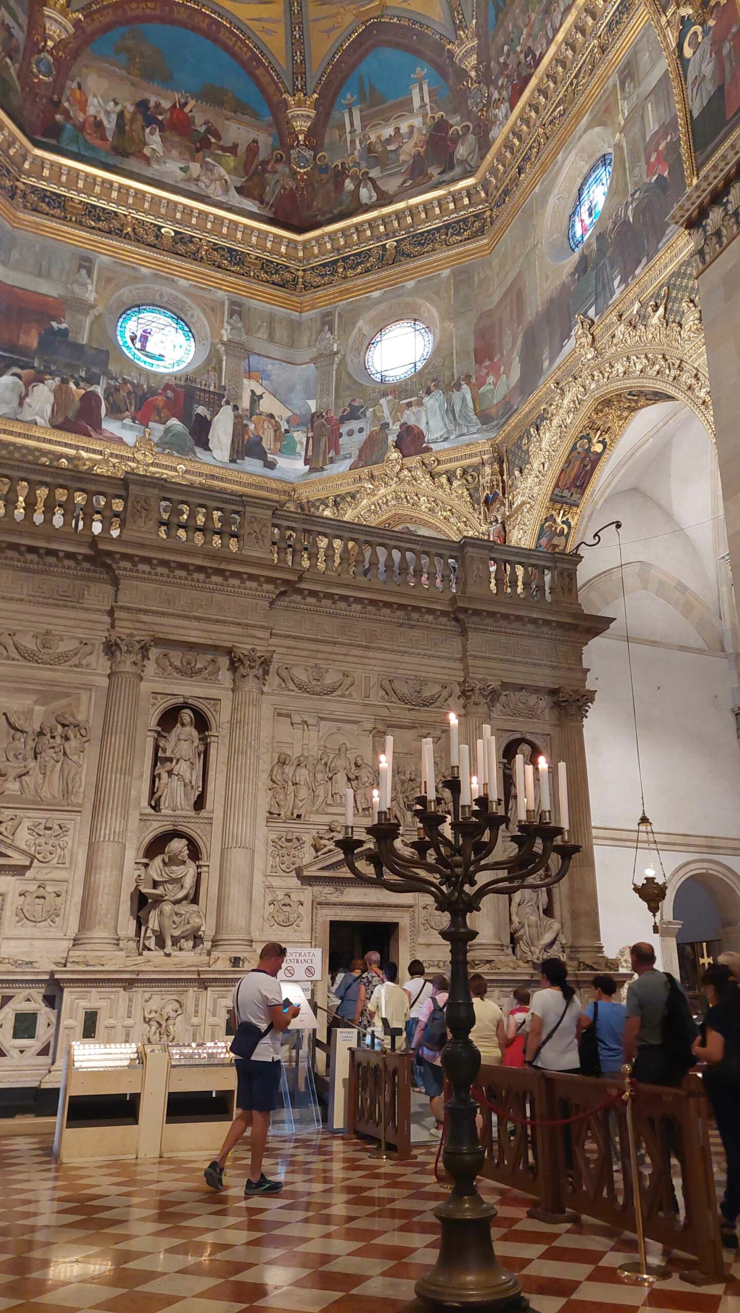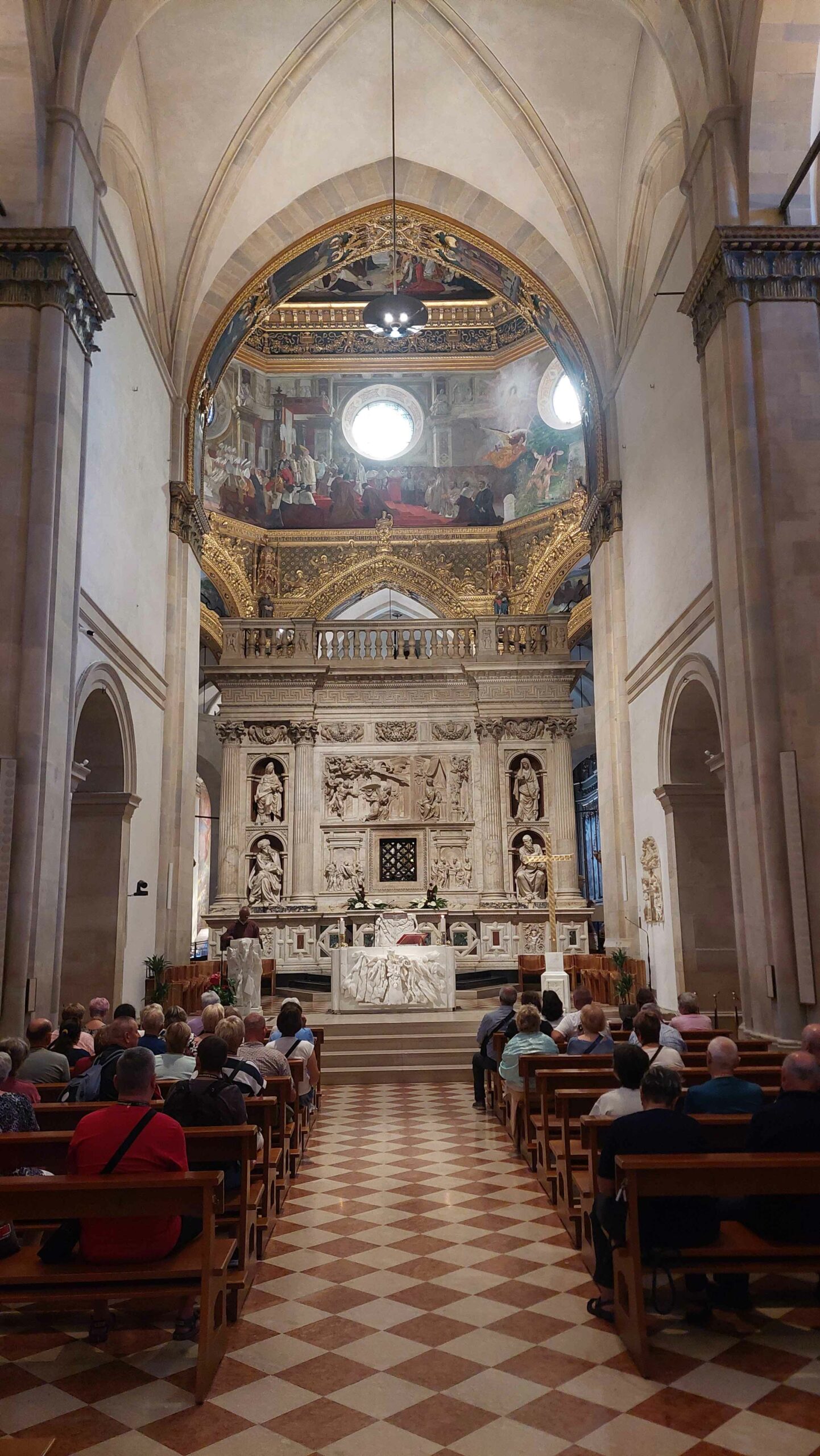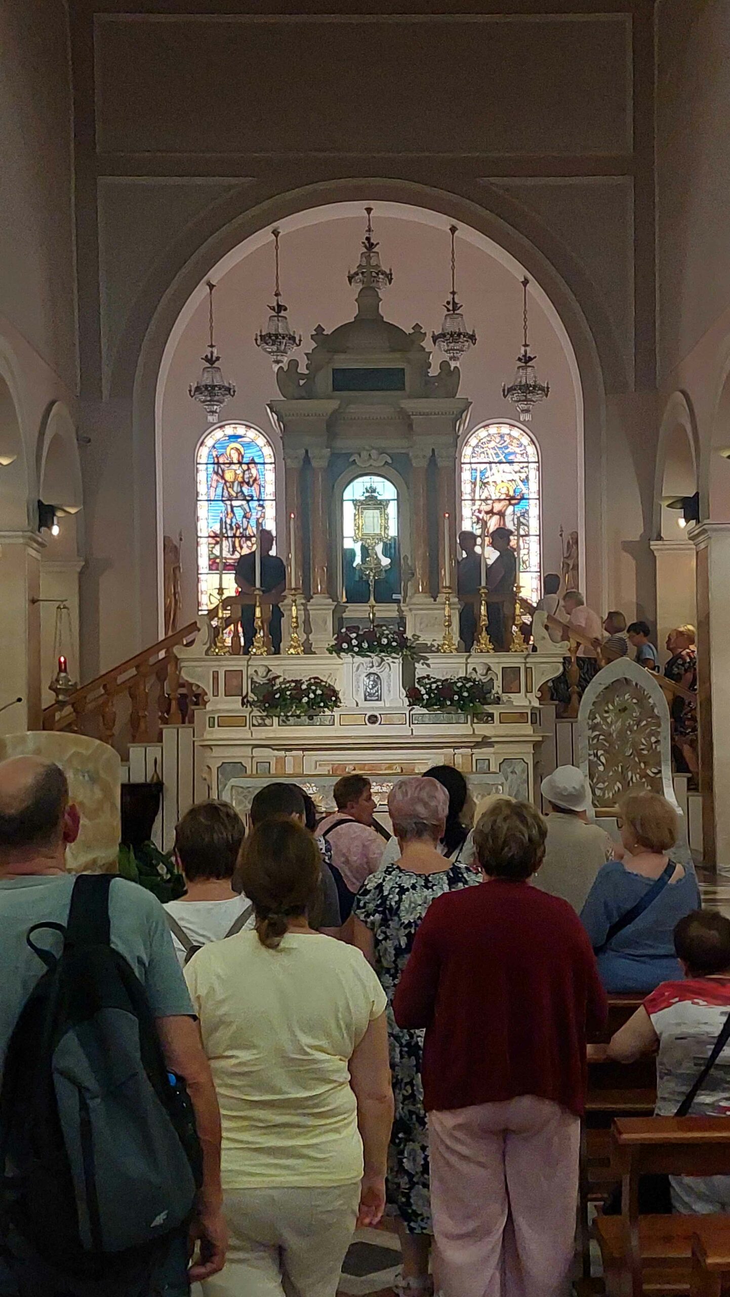 Kościół franciszkanów, w tym maleńkim miasteczku kryje się tkanina z bisioru, na której widnieje oblicze Chrystusa Zmartwychwstałego, nie ręką ludzką uczynione. Przed nim dziękowaliśmy Bogu za to pełne miłości miłosiernej spojrzenie Zbawiciela. On nie patrzy, by nas przyłapać na złu, ale uratować i poprowadzić przez życie. Śpiewając i trwając w ciszy na modlitwie, czuliśmy delikatność tego spojrzenia.