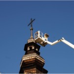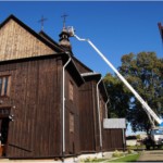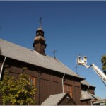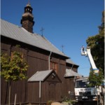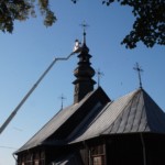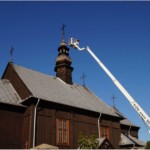 Wyremontowana z zewnątrz przed siedmiu laty wymagała już ponownej konserwacji wieży kościelnej, która najbardziej jest wystawiona na działanie czynników atmosferycznych. Ze względu na jej konstrukcję jest obiektem trudnym do realizacji takiego zabiegu. Dlatego zajęło trochę czasu znalezienie odpowiedniego wykonawcy i zgrania jego możliwości czasowych z dobrą pogodą. Zbieżność wszystkich czynników umożliwiła konserwację wieży kościoła w miniony czwartek 31 sierpnia. W trakcie prac uzupełniono brakujące gonty i poprzybijano dodatkowymi gwoździami pozostałe oraz zabezpieczono całość przez dwukrotne pomalowanie jej substancją ochronną. Całość tych prac i efekt końcowy można obejrzeć w na załączonych zdjęciach. Choć efekt lepiej oglądać w naturze.