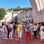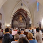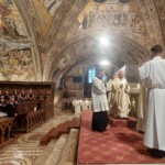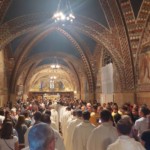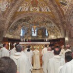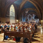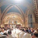 Kontynuując wędrówkę po Asyżu, odwiedziliśmy miejsca związane z życiem św. Franciszka, jego dom rodzinny, rynek miasta i wreszcie bazylikę, gdzie jest pochowany. Pod przewodnictwem brata franciszkanina dane nam było zwiedzić tę piękną świątynię. W jej krypcie znajdują się groby Biedaczyny i jego najbliższych towarzyszy. Nad nimi wznosi się kościół dolny, otoczony wieńcem kaplic, z ołtarzem głównym usytuowanym nad grobem najsławniejszego asyżjanina oraz z licznymi freskami na ścianach i suficie. Zwieńczeniem jest górny kościół z 28 scenami z życia świętego w formie fresków. I dziś uczestniczyliśmy w Eucharystii pod przewodnictwem abpa Marka Jędraszewskiego. Rozpoczął ja spiew pieśni „Gaude Mater Polonia”, która powstała z okazji kanonizacji biskupa Stanisława ze Szczepanowa w dniu 8 września 1253 roku. Obchodząc Święto Narodzenia Najświętszej Maryi Panny, zgłębialiśmy jej tajemnicę, która była bliska św. Franciszkowi. Wincenty z Kielc dał opis uroczystego ogłoszenia aktu kanonizacji krakowskiego biskupa, który został wtedy odczytany z ambony, gdzie dziś kazanie wygłosił krakowski arcybiskup. Przypomniał on prawdę o tym, że męczeństwo św. Stanisława i jego kanonizacja była swego rodzaju Bierzmowaniem narodu polskiego i początkiem drogi do jego dojrzałej wiary. Dzięki działaniu Ducha Świętego dokonało się zjednoczenie Polski i bycie przedmurzem chrześcijaństwa. Dopełnieniem tego aktu, było nowe bierzmowanie narodu polskiego dokonane przez posługę św. Jana Pawła II podczas Pielgrzymki do Polski w 1979 r.