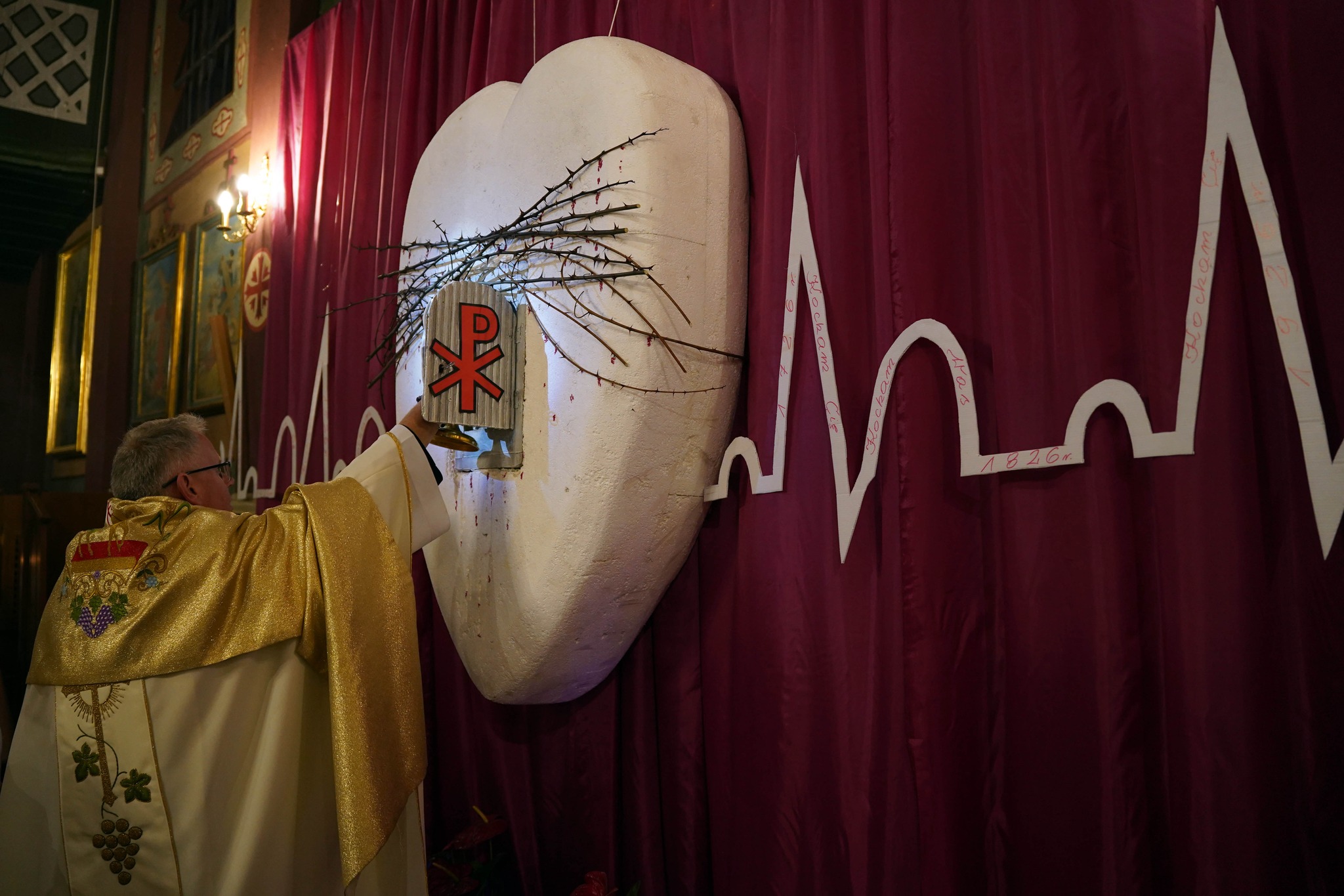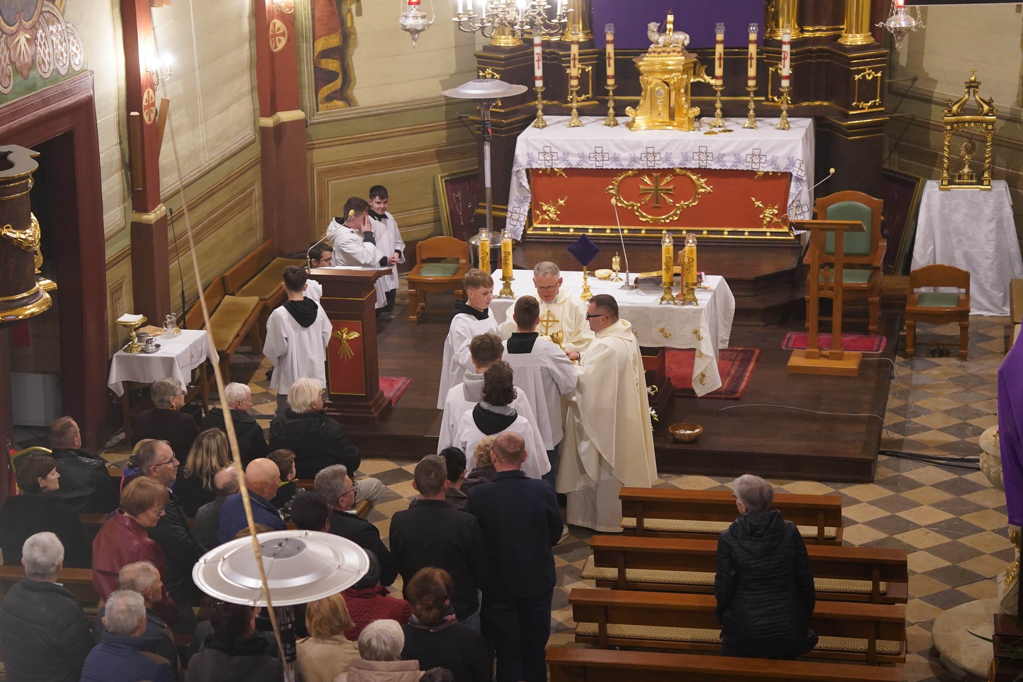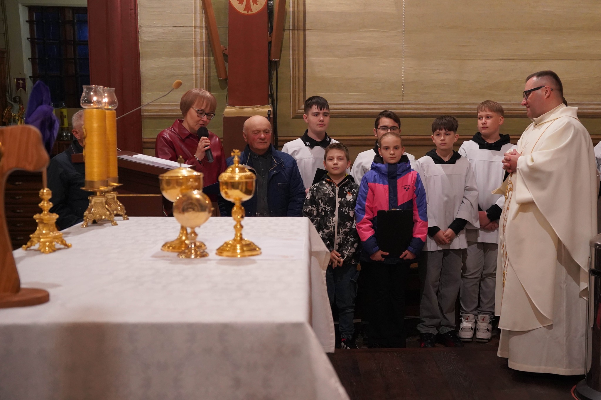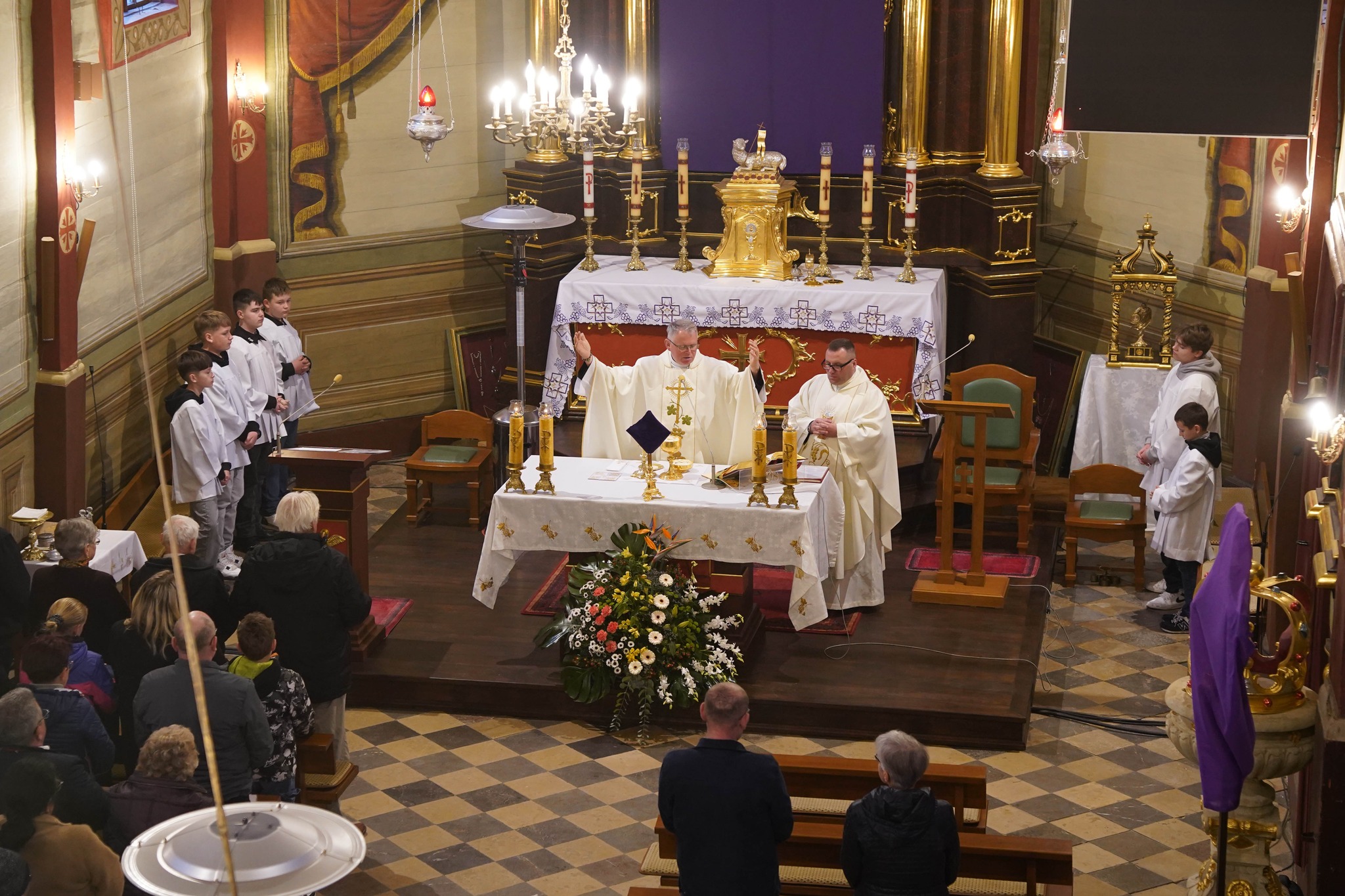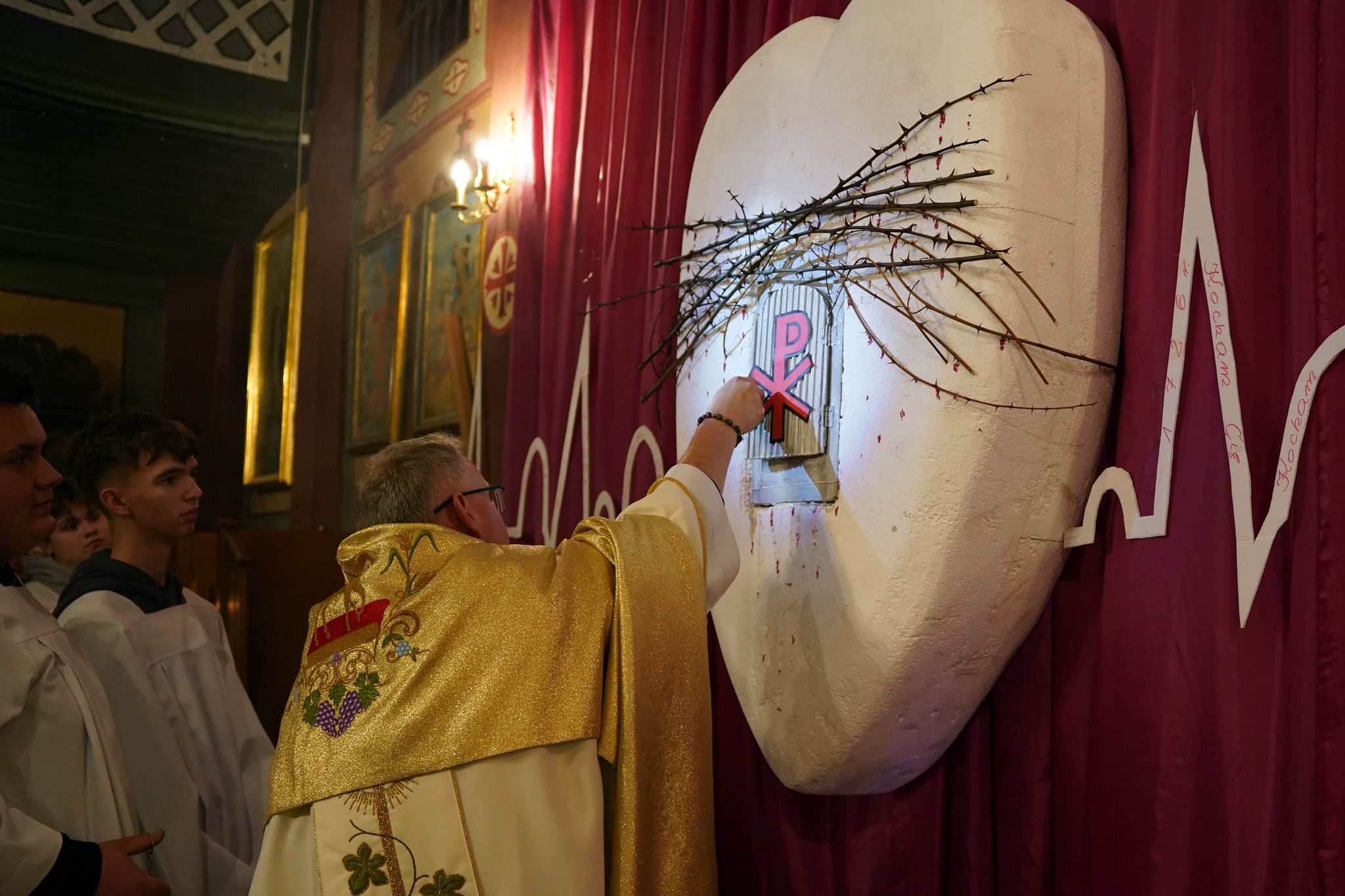 Liturgia Wielkiego Czwartku zakończyła się przeniesieniem Najświętszego Sakramentu do Ołtarza Wystawienia, czyli Ciemnicy. W tym roku jej tematyka nawiązywała do motywu serca Jezusowego, które bije dla nas, rozlewając miłość. Syn Boży scharmonizował rytm Swego serca z naszym. A od nas zależy, czy przezpelny udział w Eucharystii zjednoczymy się z Nim. Symboliczny wyrys elektrokardiogramu z napisem „Kocham Cię, Was” oraz datami stuleci istnienia naszej parafii jest pytaniem o naszą miłość i o czerpanie z mądrości przodków.