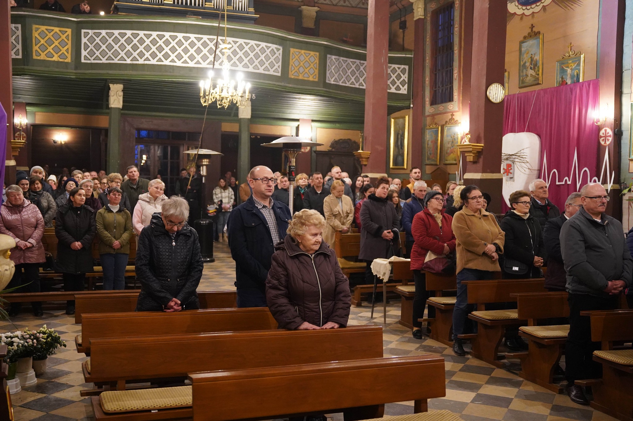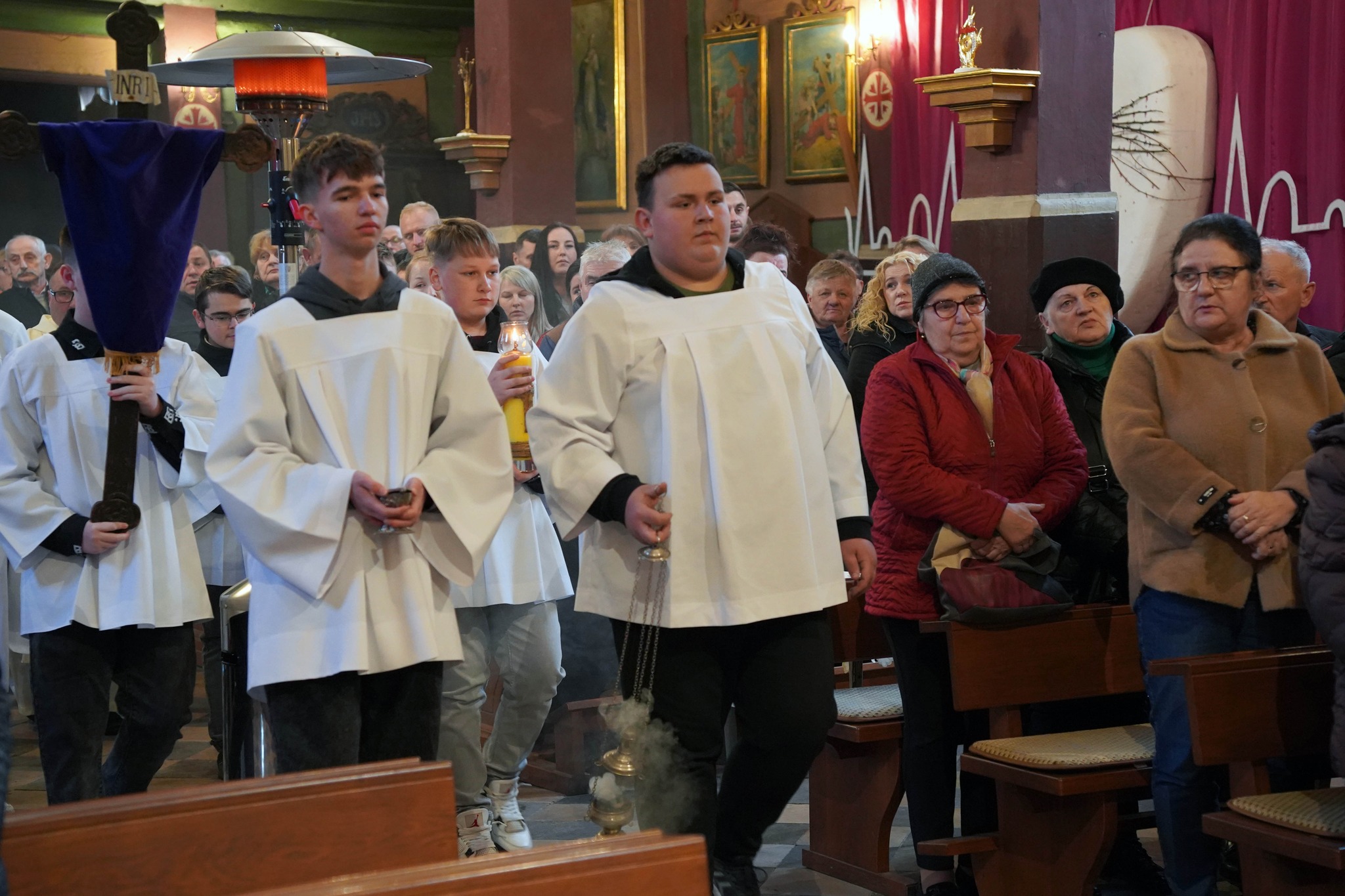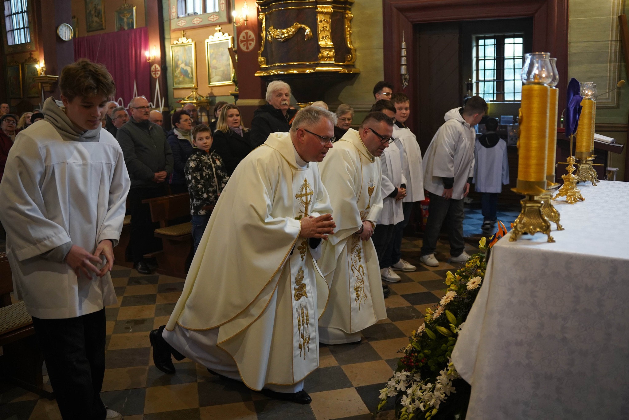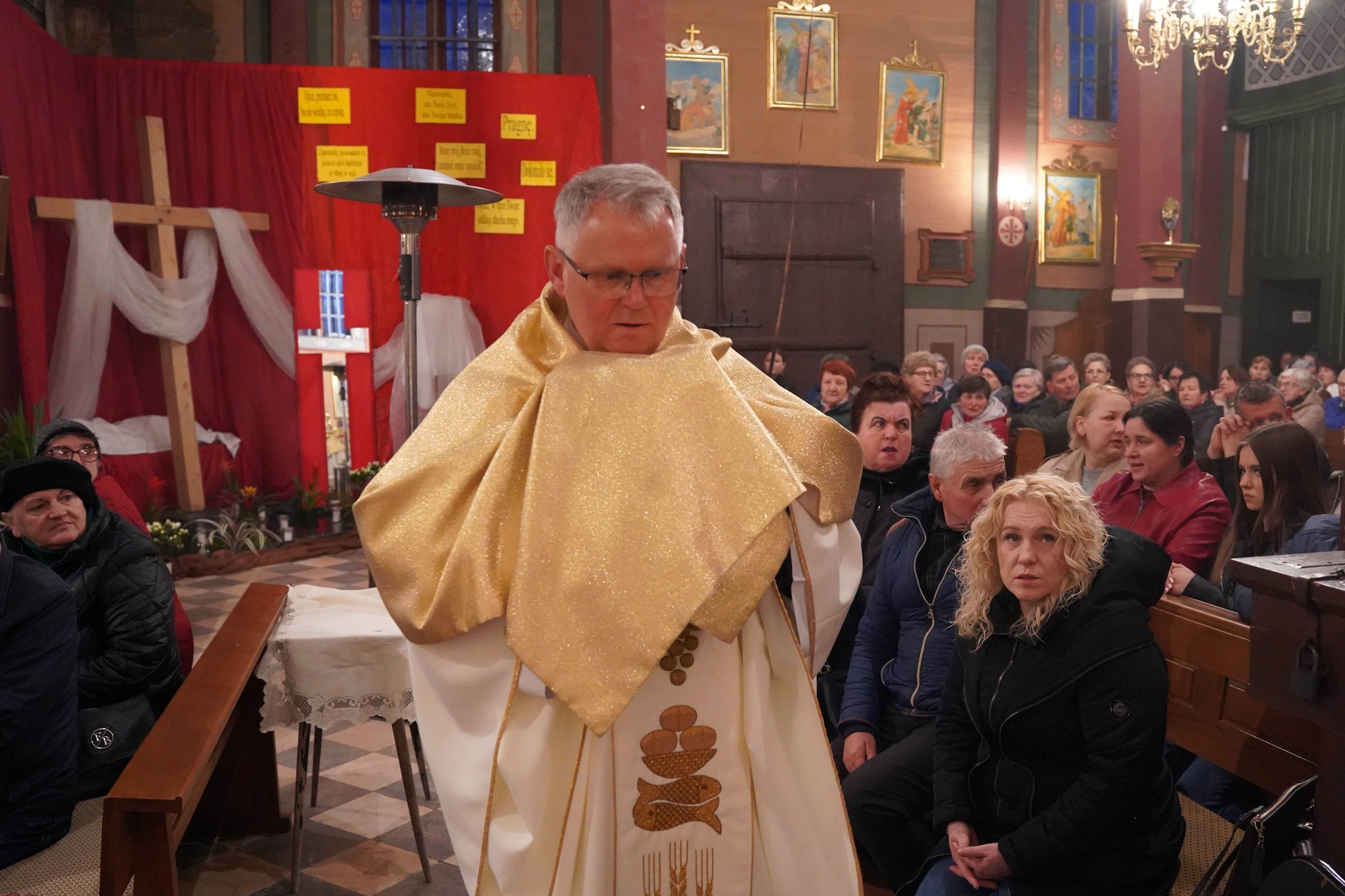 Liturgia Wielkiego Czwartku zakończyła się przeniesieniem Najświętszego Sakramentu do Ołtarza Wystawienia, czyli Ciemnicy. W tym roku jej tematyka nawiązywała do motywu serca Jezusowego, które bije dla nas, rozlewając miłość. Syn Boży scharmonizował rytm Swego serca z naszym. A od nas zależy, czy przezpelny udział w Eucharystii zjednoczymy się z Nim. Symboliczny wyrys elektrokardiogramu z napisem „Kocham Cię, Was” oraz datami stuleci istnienia naszej parafii jest pytaniem o naszą miłość i o czerpanie z mądrości przodków.