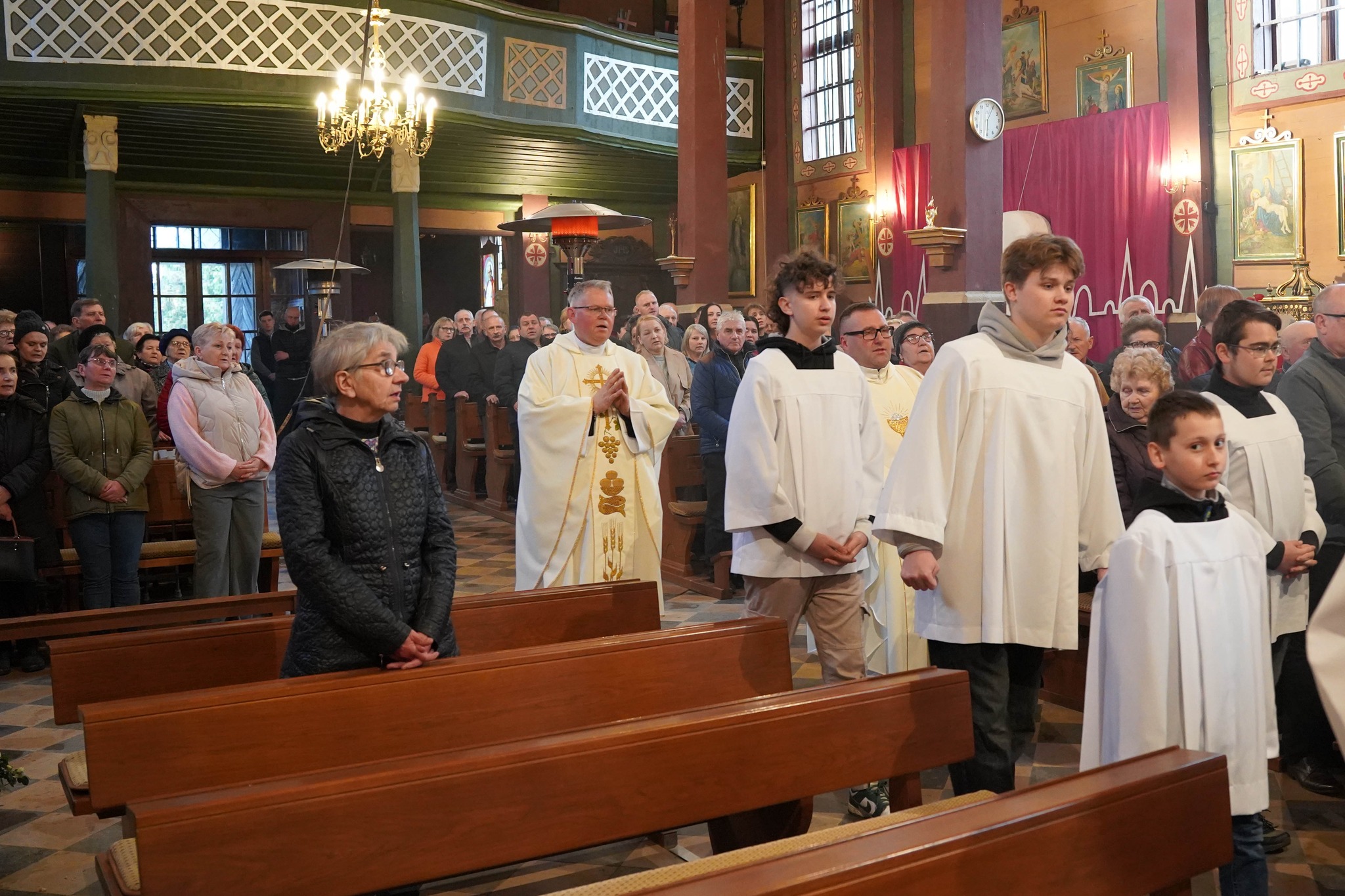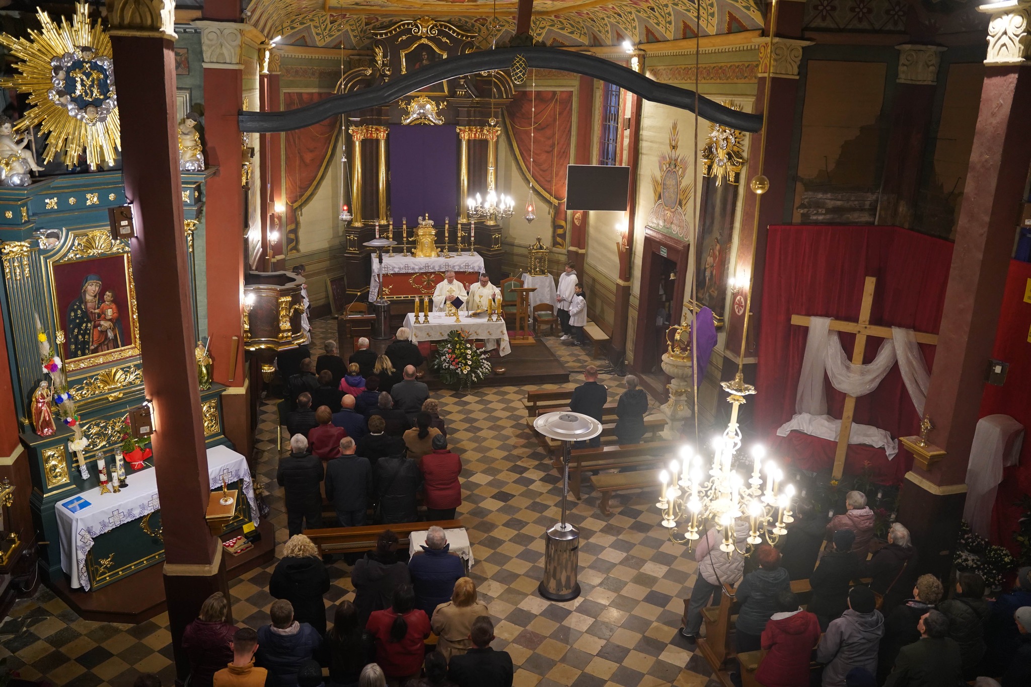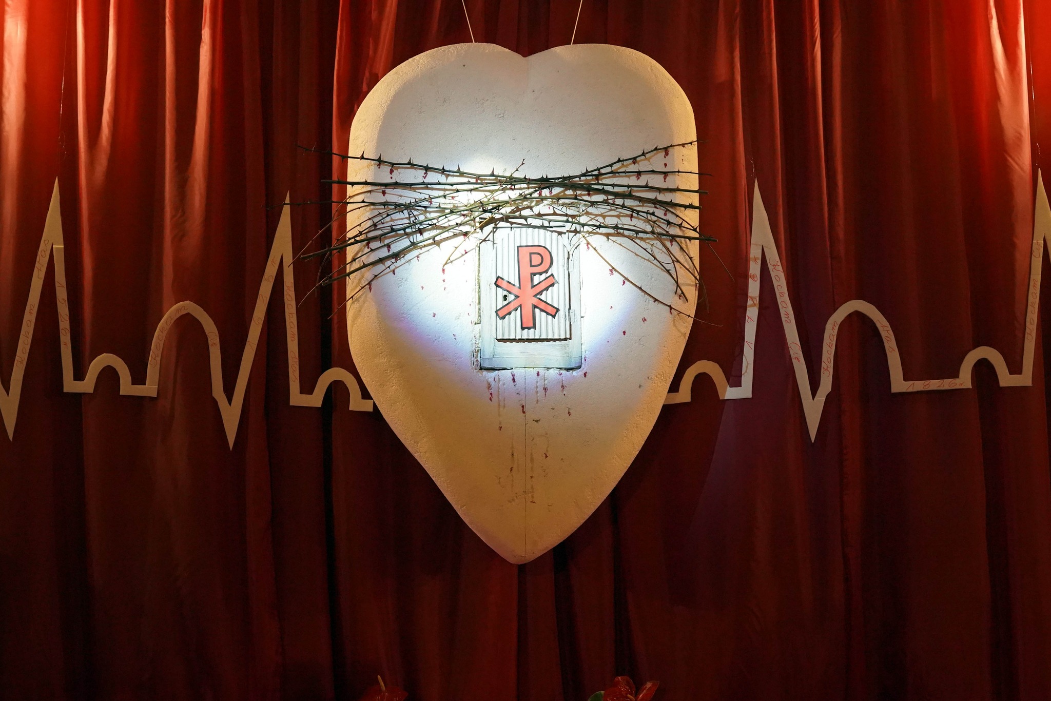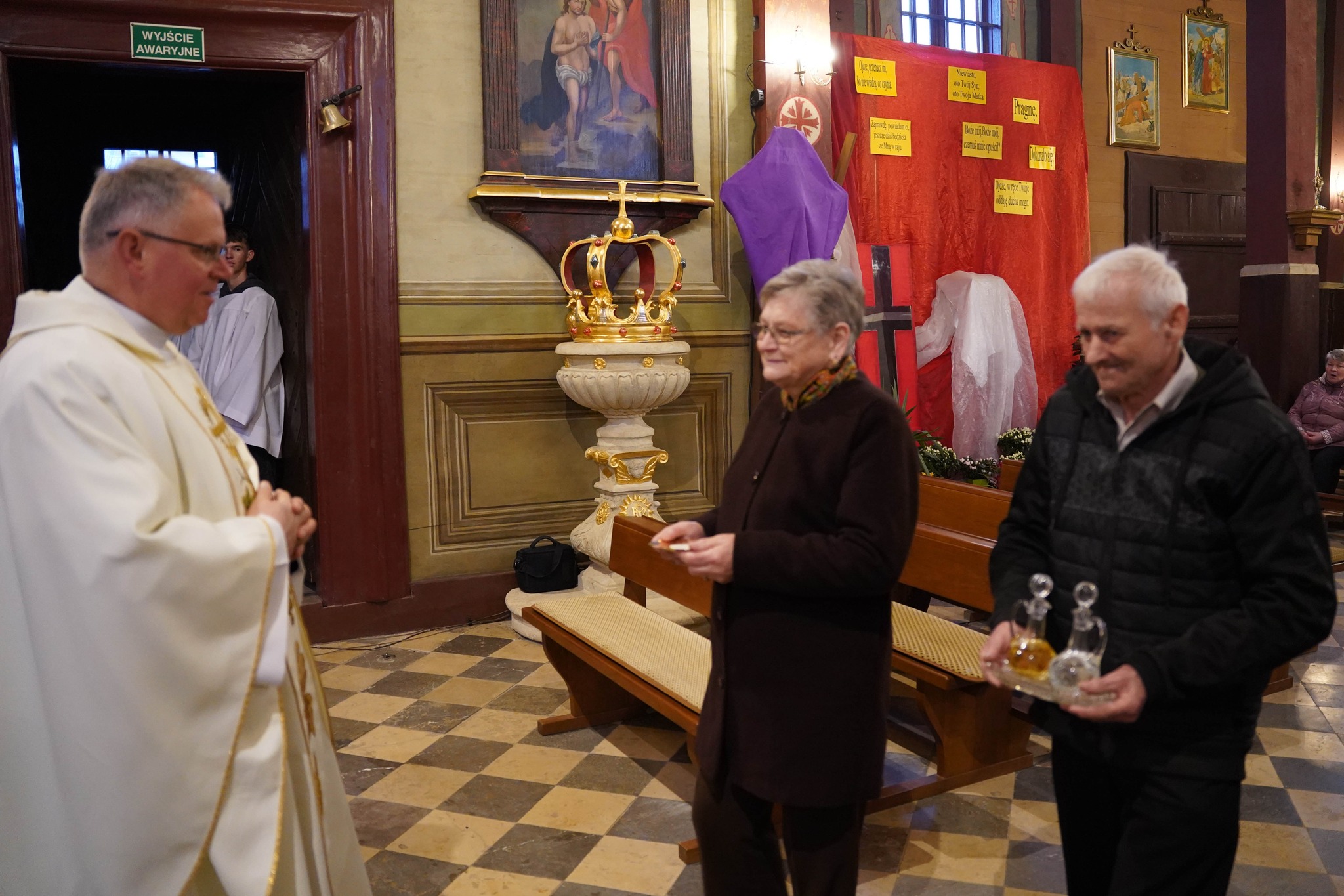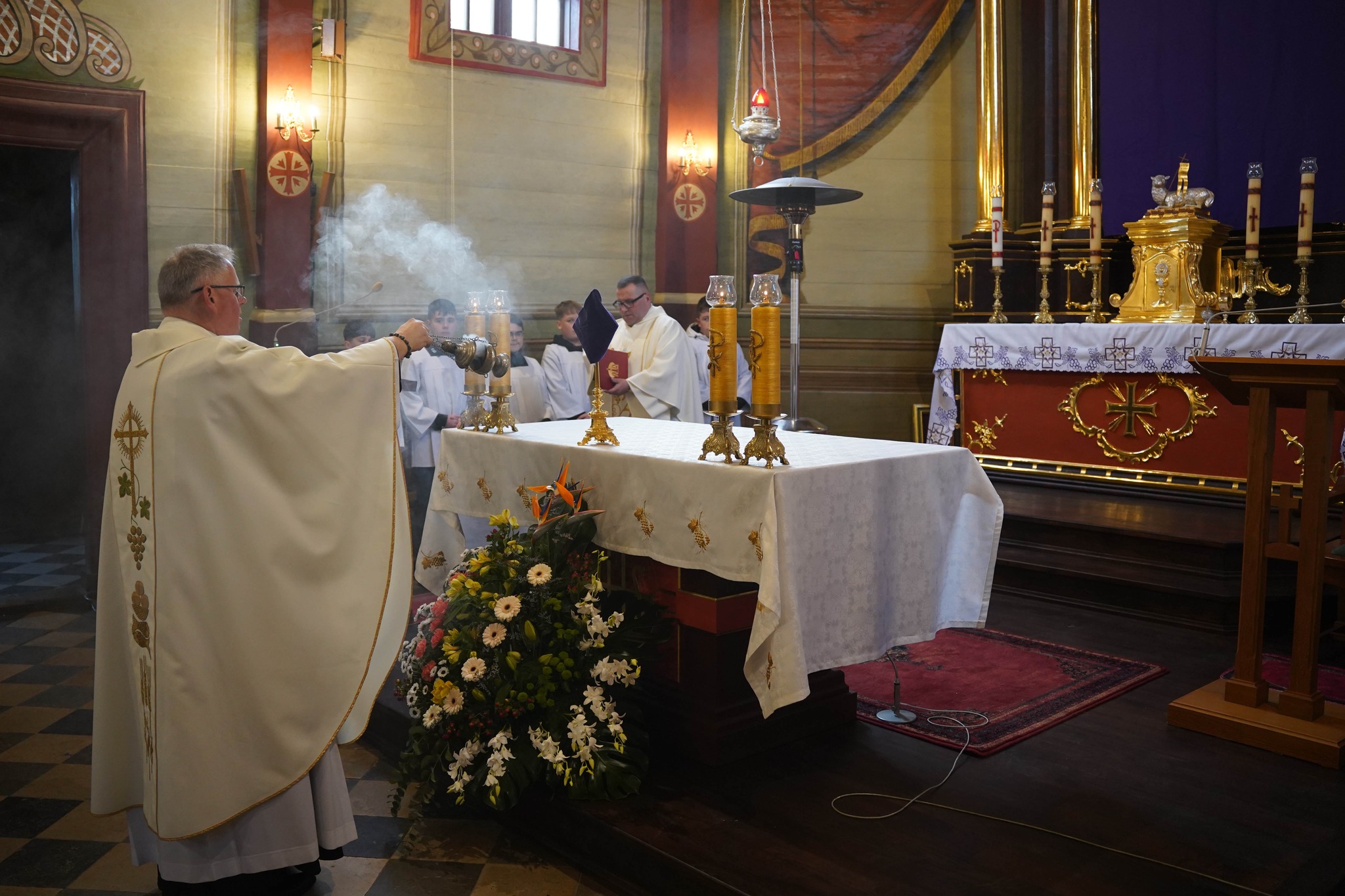 Liturgia Wielkiego Czwartku zakończyła się przeniesieniem Najświętszego Sakramentu do Ołtarza Wystawienia, czyli Ciemnicy. W tym roku jej tematyka nawiązywała do motywu serca Jezusowego, które bije dla nas, rozlewając miłość. Syn Boży scharmonizował rytm Swego serca z naszym. A od nas zależy, czy przezpelny udział w Eucharystii zjednoczymy się z Nim. Symboliczny wyrys elektrokardiogramu z napisem „Kocham Cię, Was” oraz datami stuleci istnienia naszej parafii jest pytaniem o naszą miłość i o czerpanie z mądrości przodków.