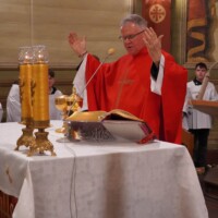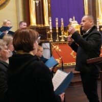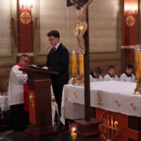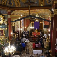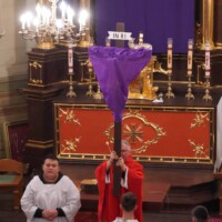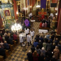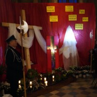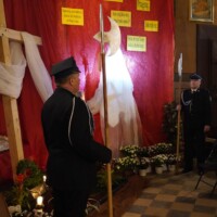 Po wykonaniu Pasji przez chór i solistów, ksiądz Proboszcz przypomniał, że męka Chrystusa jest zestrojeniem serca Jezusa z naszym. On przyszedł wyzwolić nas z mocy Złego, grzechu i śmierci. Jego misja dopełniła się w ofierze krzyża, a z przebitego wtedy serca wypłynęły zdroje łask. Do tego nawiązuje tegoroczna grobu Pańskiego. Sadzawka przypomina o łasce Bożej, która przyjęta powoduje, że płoniemy światłem nadprzyrodzonym i stajemy się jak piękne, różnorodne kwiaty. Siedem świec i ozdobnych kwiatów nawiązuje do siedmiu wieków naszej parafii. Te minione lata to tysiące historii ludzkich, pięknych przez przyjmowane Boże dary. I dziś Bóg rozlewa Swe łaski, szczególnie przez sakramenty i modlitwę. Umieszczone w dekoracji lustro w formie krzyża zachęca do przyjrzenia się sobie. Zapytania o stan naszego korzystania z tych darów, ale i uwierzenia, że Wszechmocnego nigdy nie jest za późno na odnowę. On nigdy nami nie gardzi, choć nie ukrywa, że przemiana kosztuje, jest krzyżem. Lecz przecież bez śmierci dla tego złe nie ma Zmartwychwstania do świętości, dla dobra. Zachęceni też byliśmy do zatrzymania się i rozważenia siedmiu ostatnich słów Jezusa.