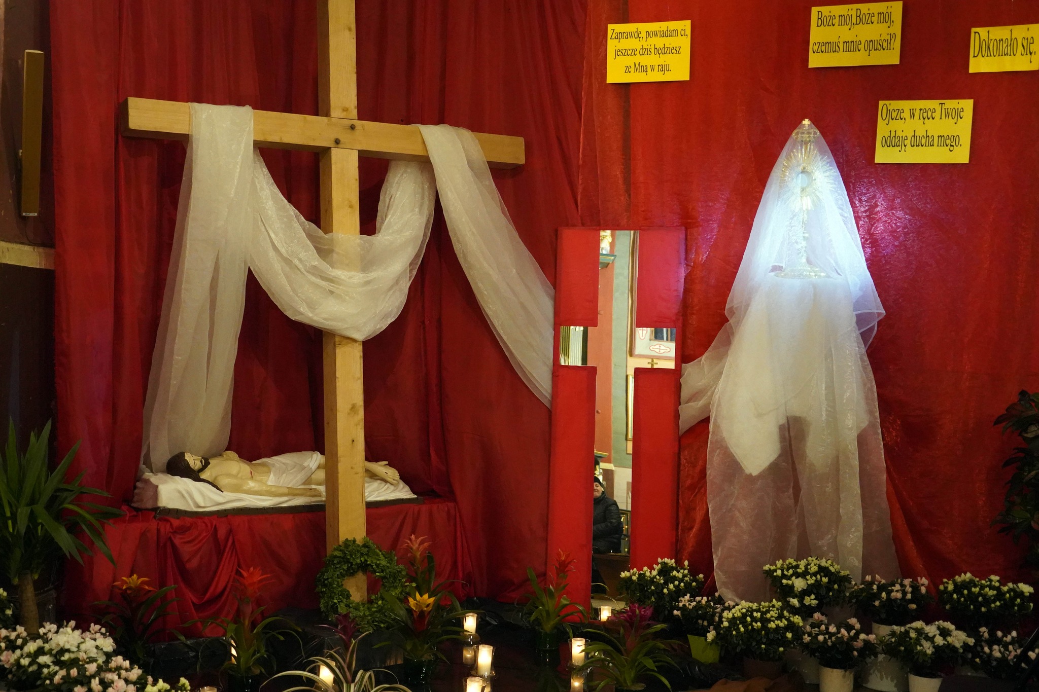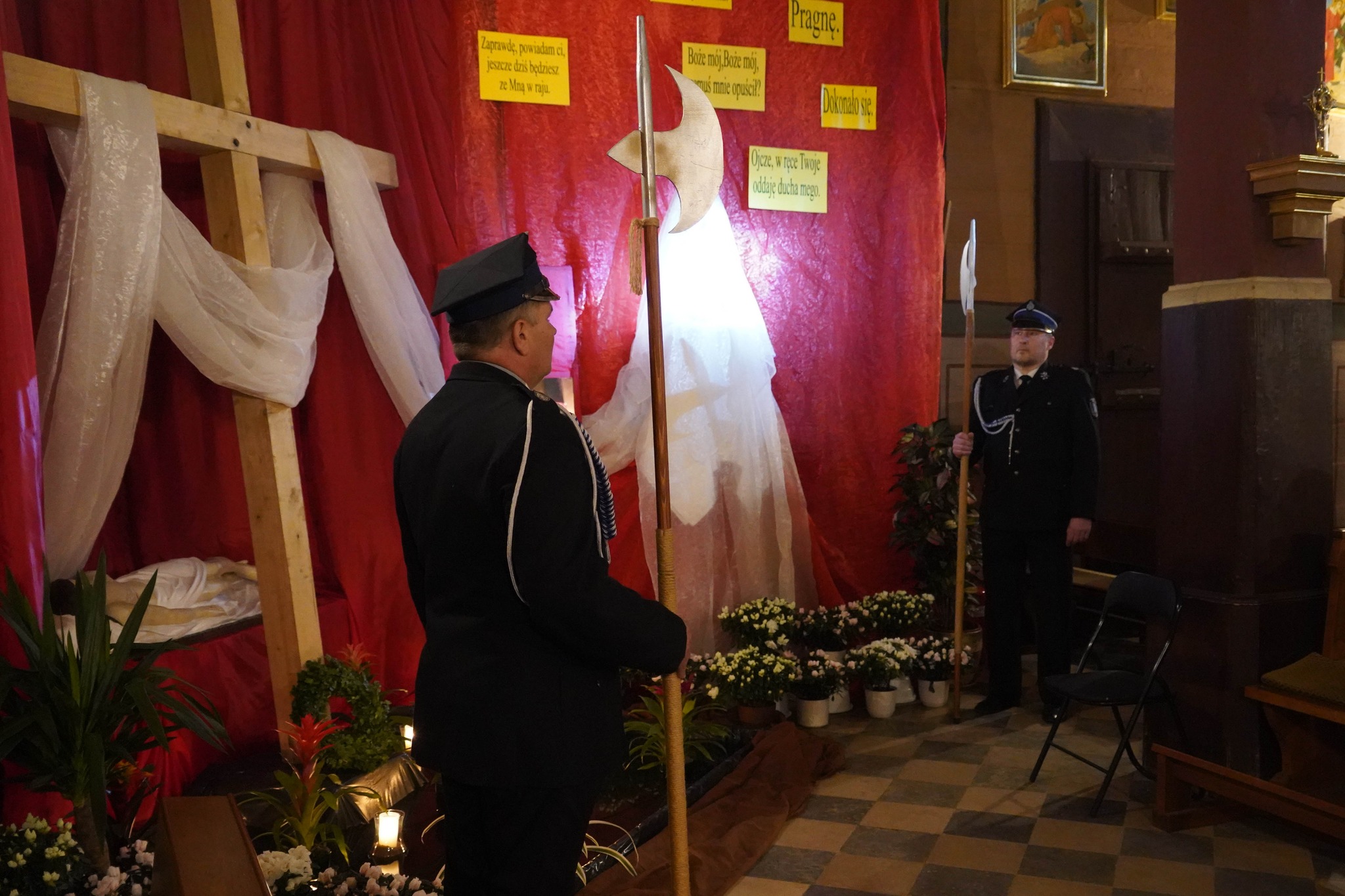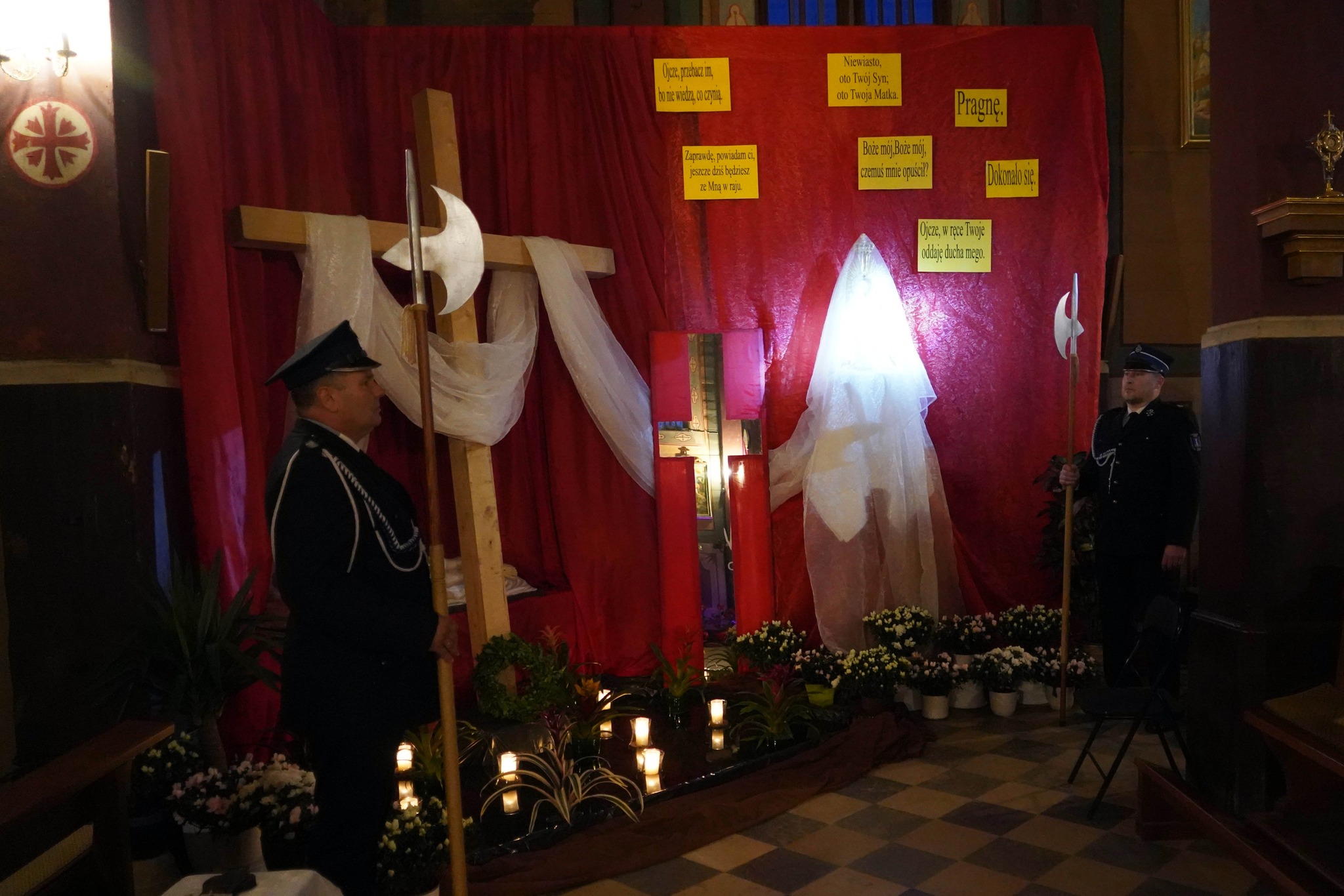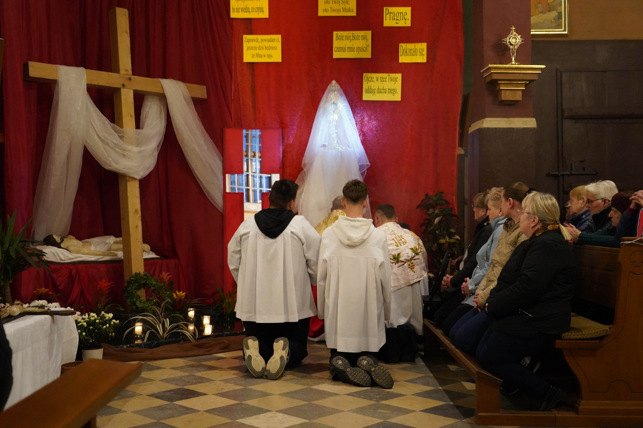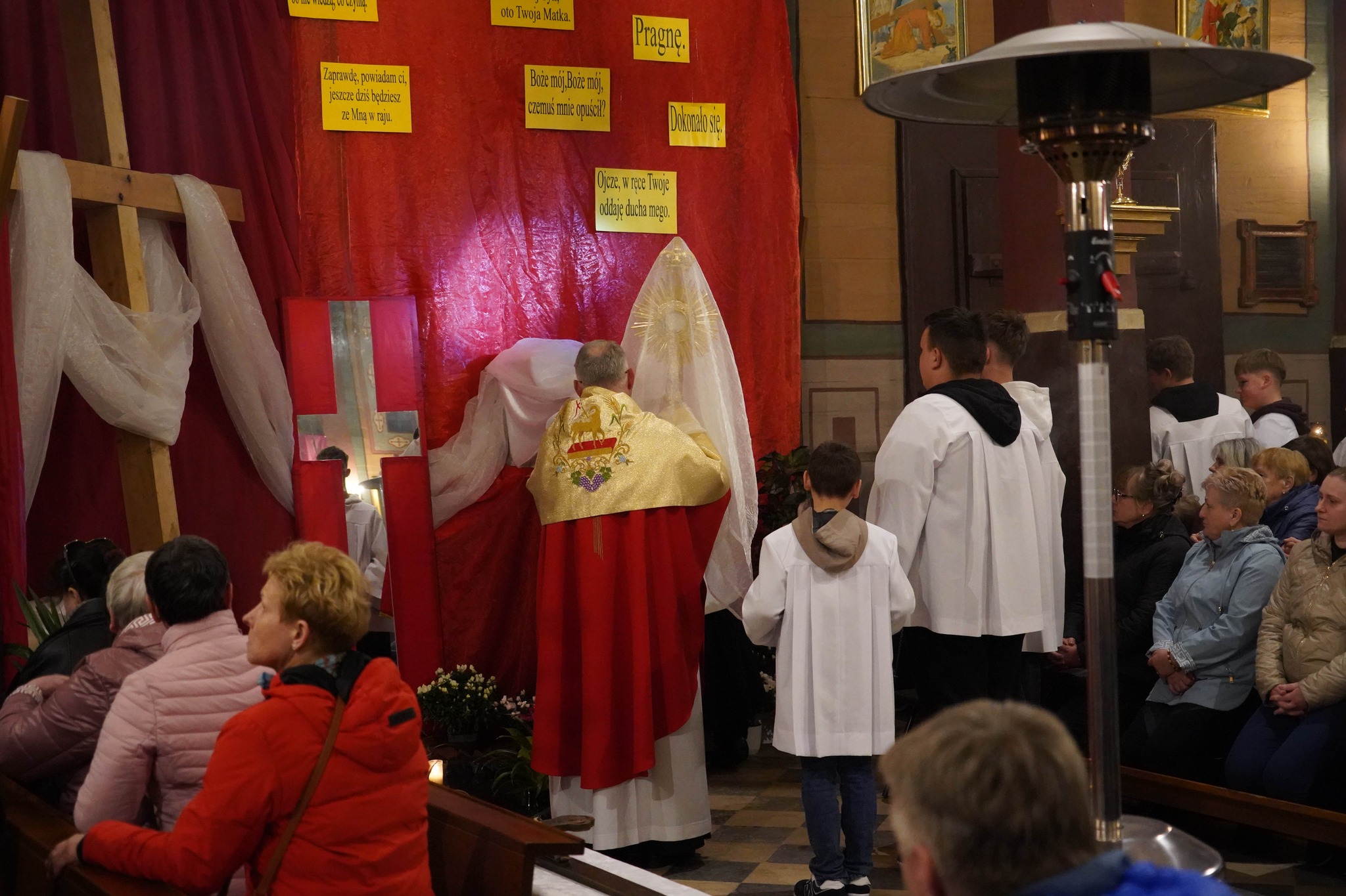 Po wykonaniu Pasji przez chór i solistów, ksiądz Proboszcz przypomniał, że męka Chrystusa jest zestrojeniem serca Jezusa z naszym. On przyszedł wyzwolić nas z mocy Złego, grzechu i śmierci. Jego misja dopełniła się w ofierze krzyża, a z przebitego wtedy serca wypłynęły zdroje łask. Do tego nawiązuje tegoroczna grobu Pańskiego. Sadzawka przypomina o łasce Bożej, która przyjęta powoduje, że płoniemy światłem nadprzyrodzonym i stajemy się jak piękne, różnorodne kwiaty. Siedem świec i ozdobnych kwiatów nawiązuje do siedmiu wieków naszej parafii. Te minione lata to tysiące historii ludzkich, pięknych przez przyjmowane Boże dary. I dziś Bóg rozlewa Swe łaski, szczególnie przez sakramenty i modlitwę. Umieszczone w dekoracji lustro w formie krzyża zachęca do przyjrzenia się sobie. Zapytania o stan naszego korzystania z tych darów, ale i uwierzenia, że Wszechmocnego nigdy nie jest za późno na odnowę. On nigdy nami nie gardzi, choć nie ukrywa, że przemiana kosztuje, jest krzyżem. Lecz przecież bez śmierci dla tego złe nie ma Zmartwychwstania do świętości, dla dobra. Zachęceni też byliśmy do zatrzymania się i rozważenia siedmiu ostatnich słów Jezusa.
