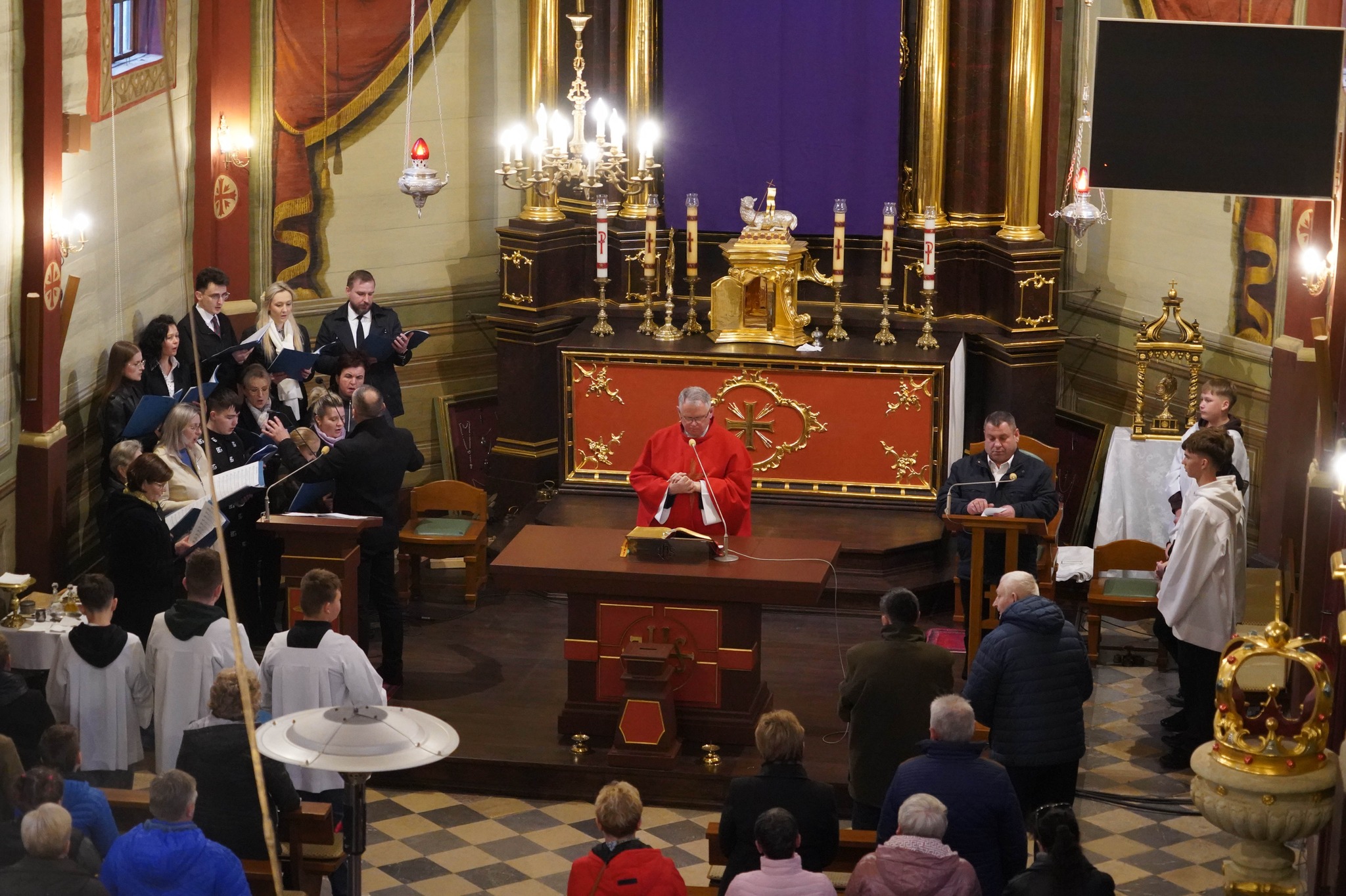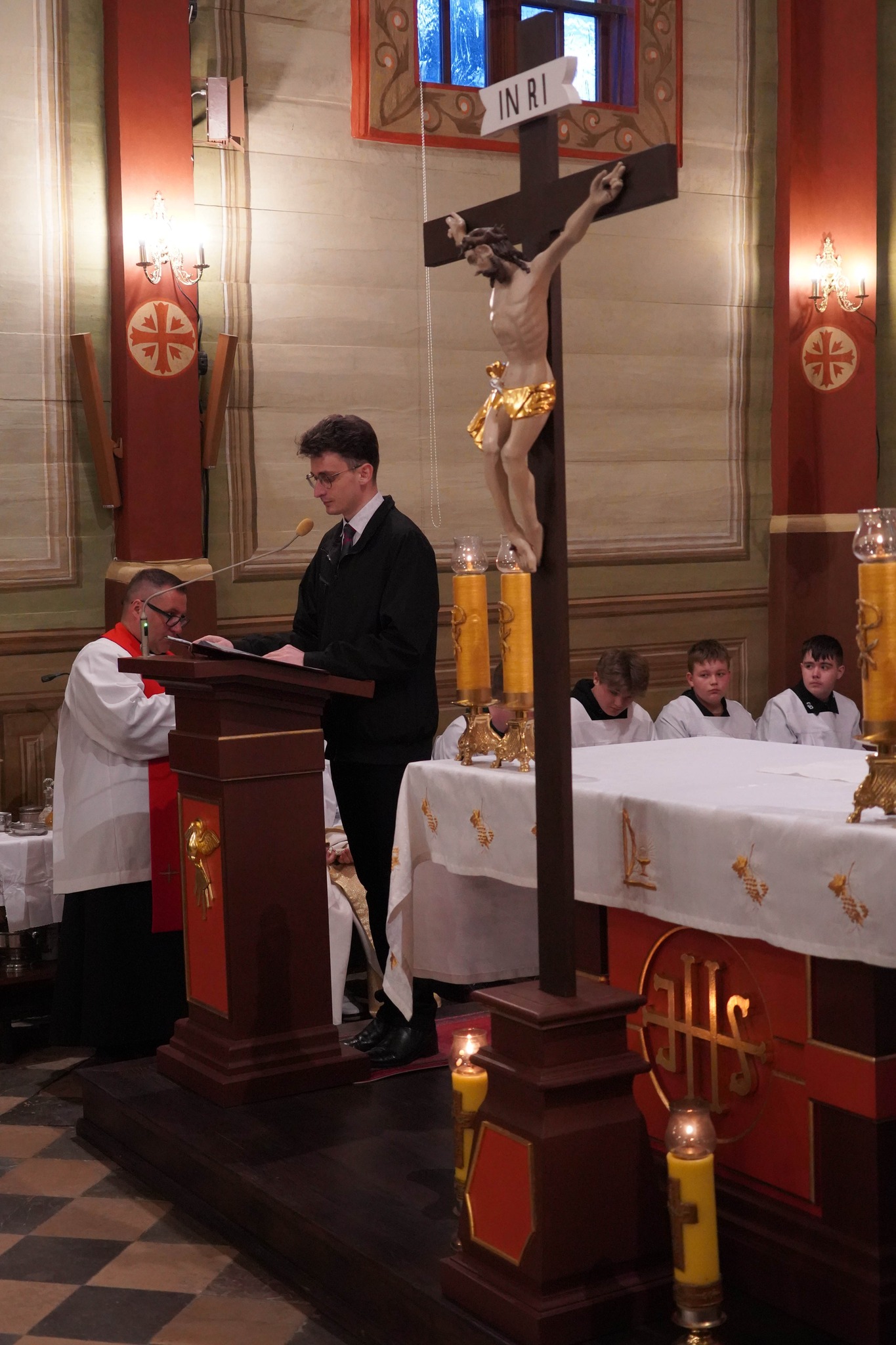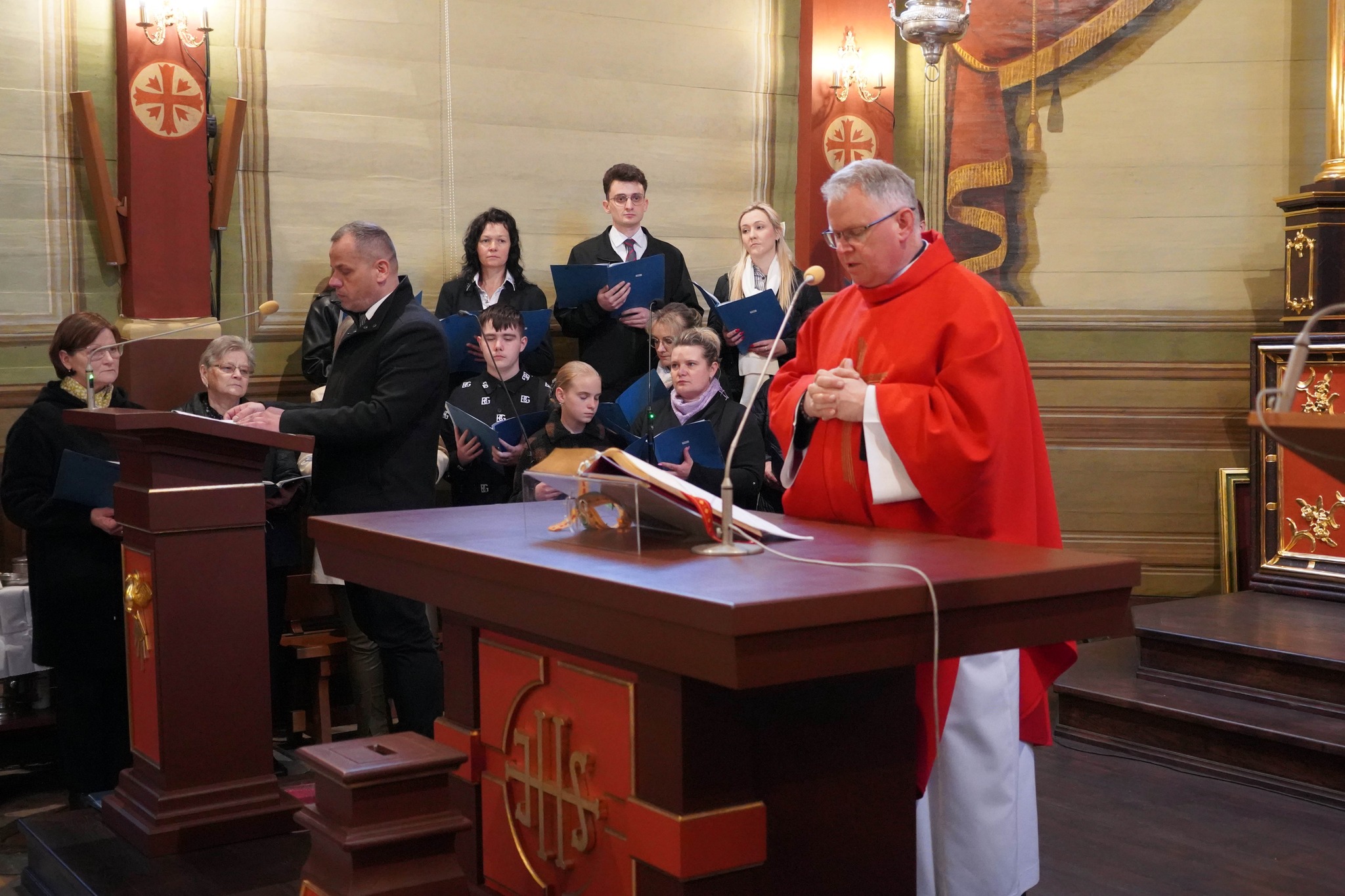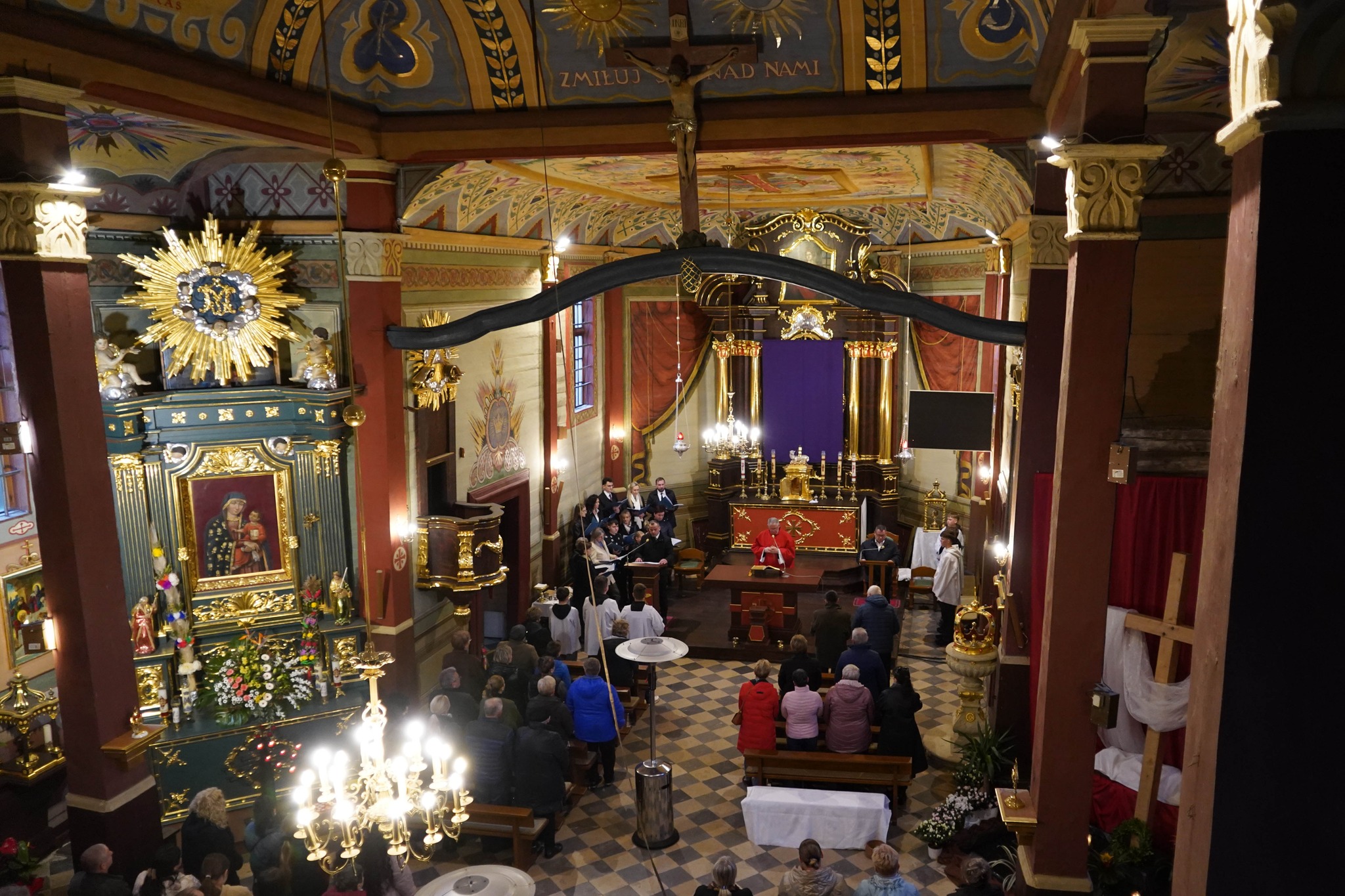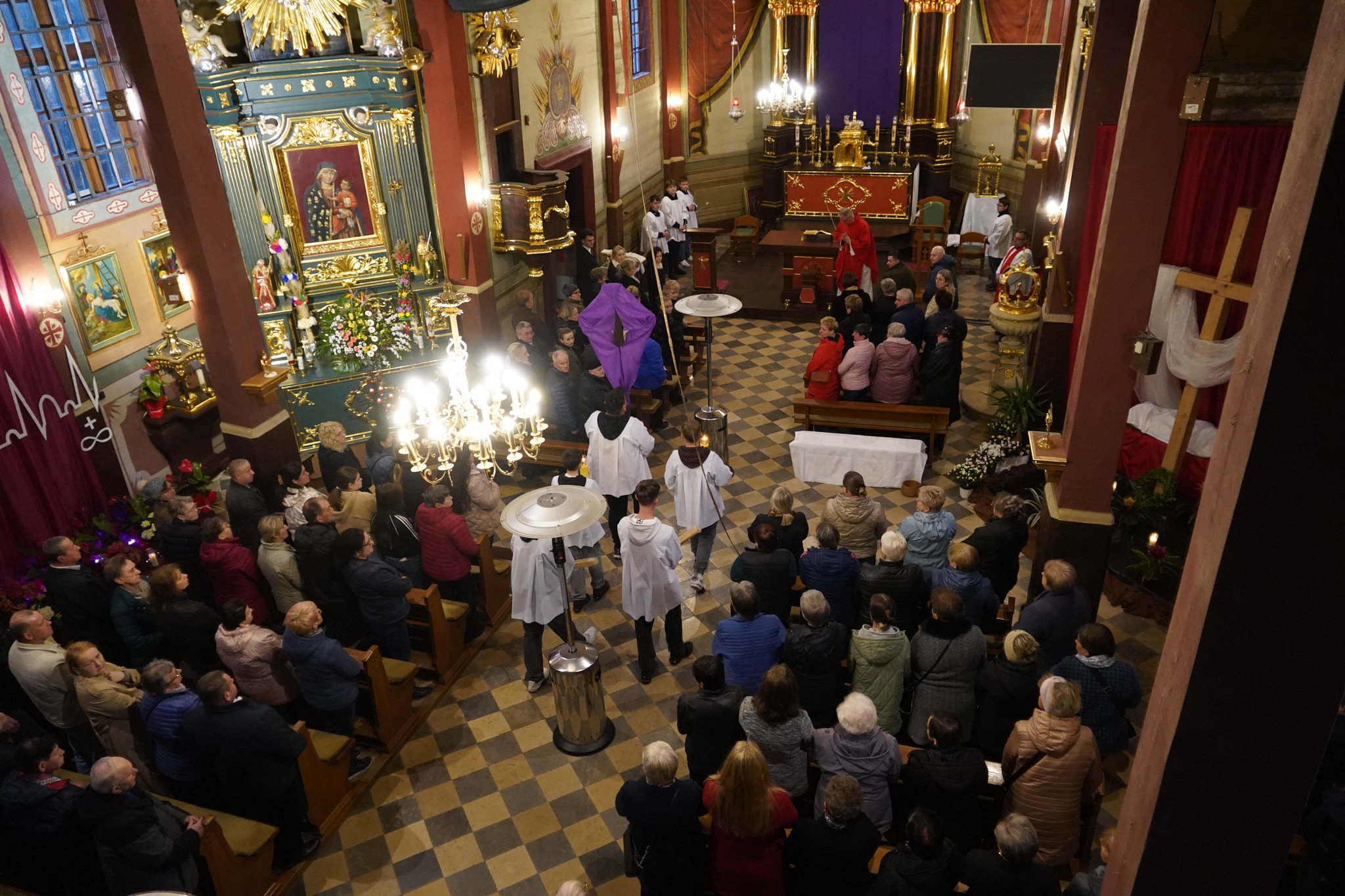 Po wykonaniu Pasji przez chór i solistów, ksiądz Proboszcz przypomniał, że męka Chrystusa jest zestrojeniem serca Jezusa z naszym. On przyszedł wyzwolić nas z mocy Złego, grzechu i śmierci. Jego misja dopełniła się w ofierze krzyża, a z przebitego wtedy serca wypłynęły zdroje łask. Do tego nawiązuje tegoroczna grobu Pańskiego. Sadzawka przypomina o łasce Bożej, która przyjęta powoduje, że płoniemy światłem nadprzyrodzonym i stajemy się jak piękne, różnorodne kwiaty. Siedem świec i ozdobnych kwiatów nawiązuje do siedmiu wieków naszej parafii. Te minione lata to tysiące historii ludzkich, pięknych przez przyjmowane Boże dary. I dziś Bóg rozlewa Swe łaski, szczególnie przez sakramenty i modlitwę. Umieszczone w dekoracji lustro w formie krzyża zachęca do przyjrzenia się sobie. Zapytania o stan naszego korzystania z tych darów, ale i uwierzenia, że Wszechmocnego nigdy nie jest za późno na odnowę. On nigdy nami nie gardzi, choć nie ukrywa, że przemiana kosztuje, jest krzyżem. Lecz przecież bez śmierci dla tego złe nie ma Zmartwychwstania do świętości, dla dobra. Zachęceni też byliśmy do zatrzymania się i rozważenia siedmiu ostatnich słów Jezusa.