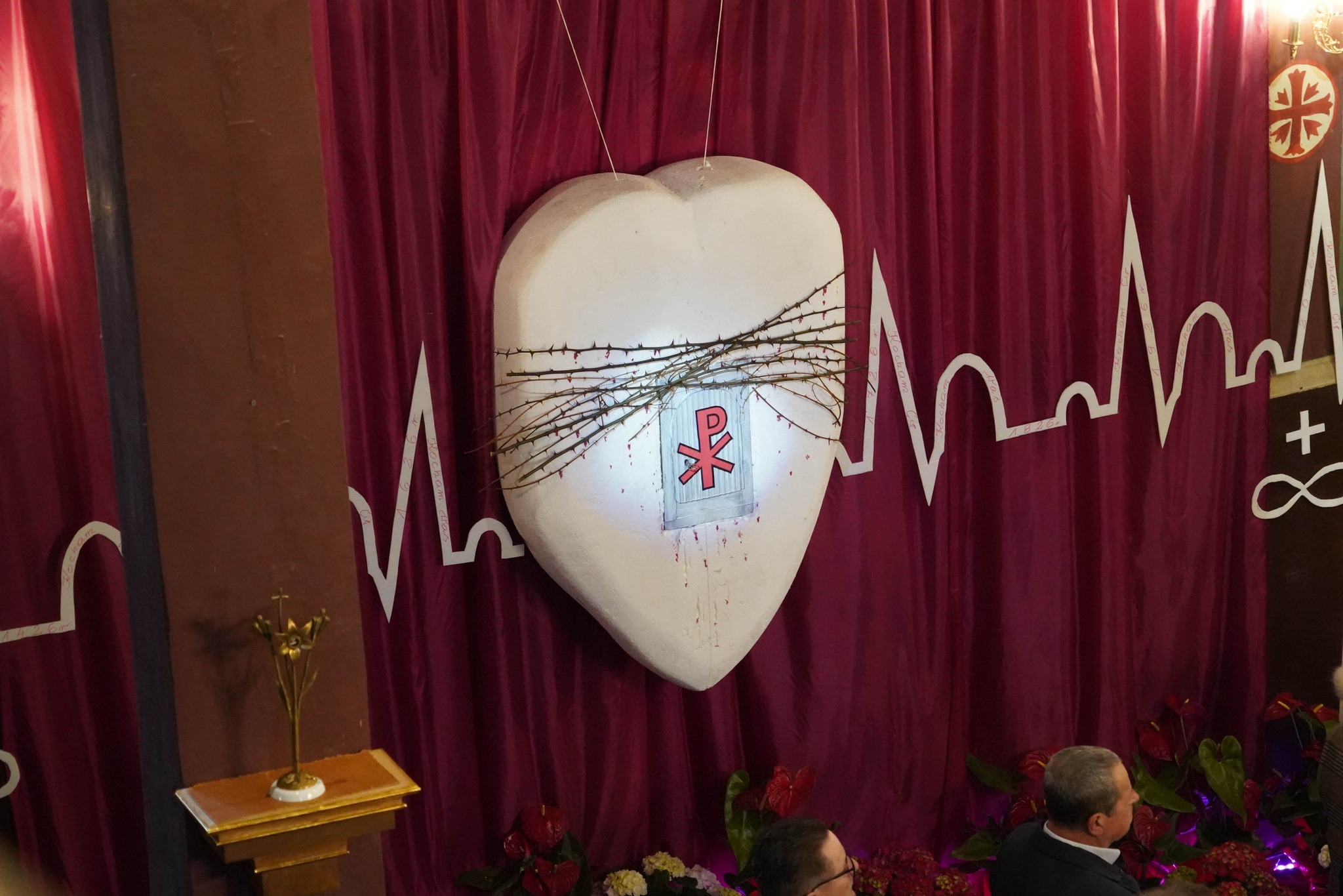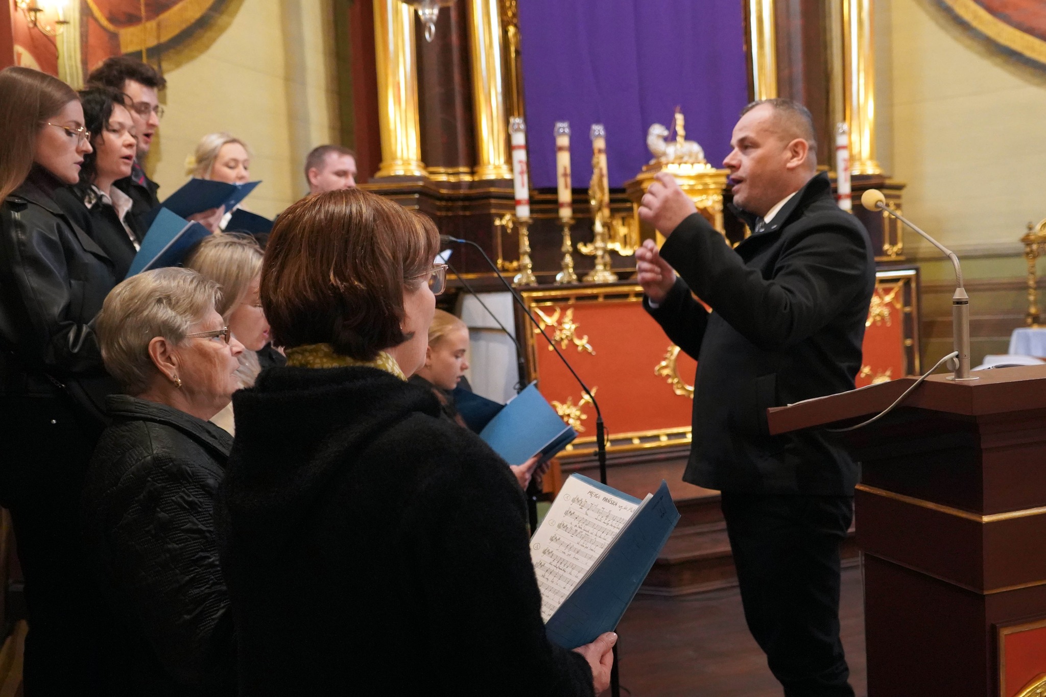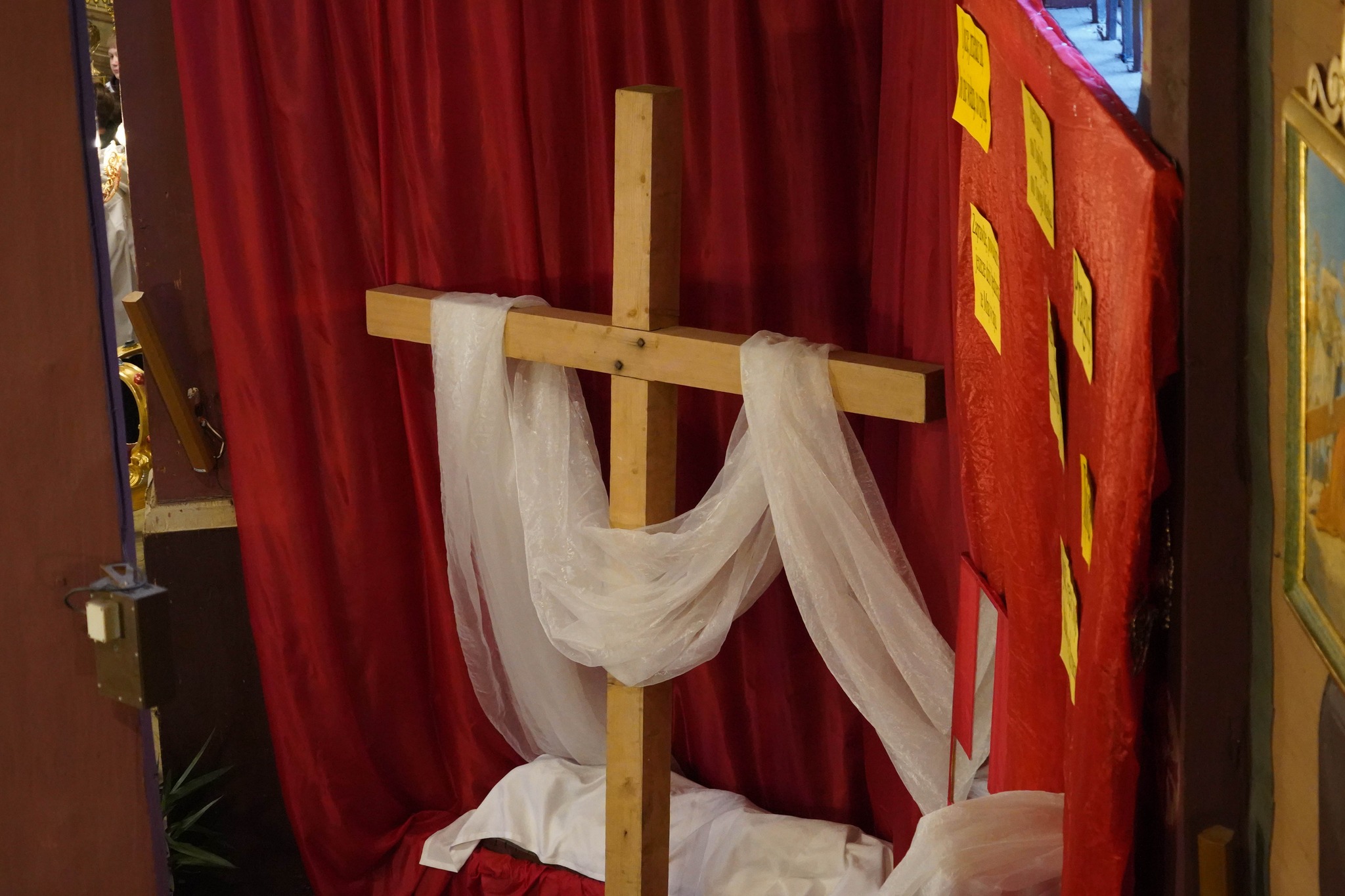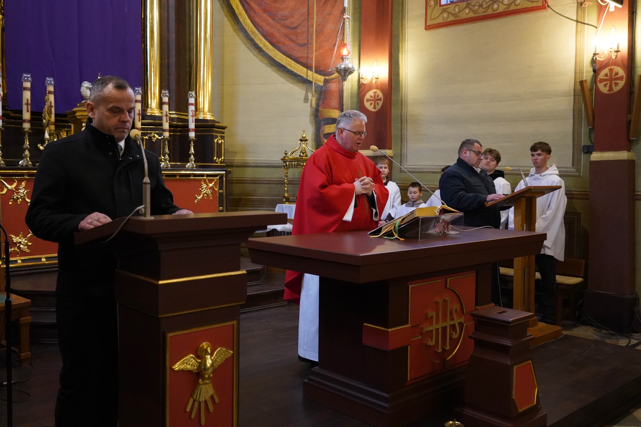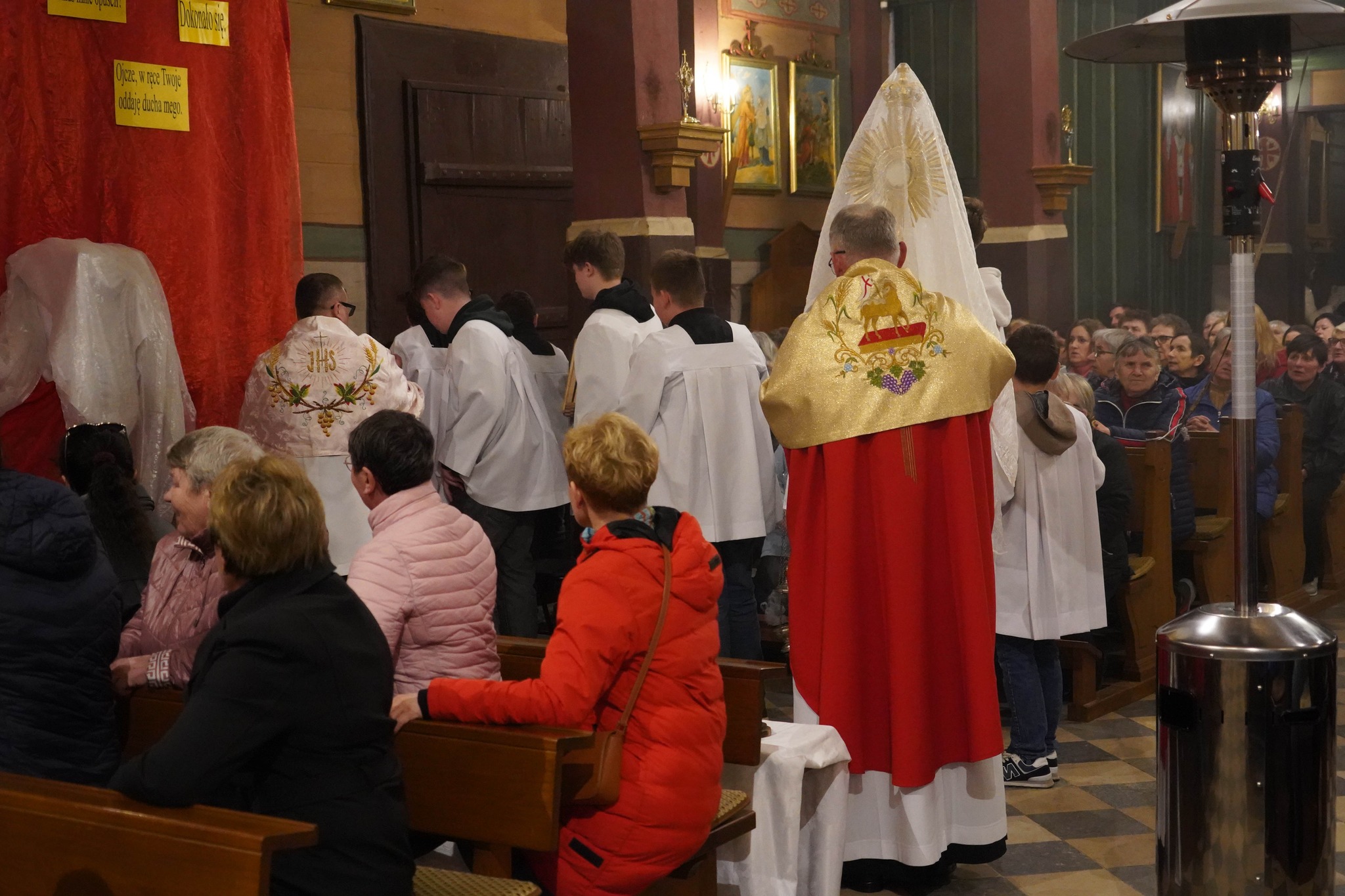 Po wykonaniu Pasji przez chór i solistów, ksiądz Proboszcz przypomniał, że męka Chrystusa jest zestrojeniem serca Jezusa z naszym. On przyszedł wyzwolić nas z mocy Złego, grzechu i śmierci. Jego misja dopełniła się w ofierze krzyża, a z przebitego wtedy serca wypłynęły zdroje łask. Do tego nawiązuje tegoroczna grobu Pańskiego. Sadzawka przypomina o łasce Bożej, która przyjęta powoduje, że płoniemy światłem nadprzyrodzonym i stajemy się jak piękne, różnorodne kwiaty. Siedem świec i ozdobnych kwiatów nawiązuje do siedmiu wieków naszej parafii. Te minione lata to tysiące historii ludzkich, pięknych przez przyjmowane Boże dary. I dziś Bóg rozlewa Swe łaski, szczególnie przez sakramenty i modlitwę. Umieszczone w dekoracji lustro w formie krzyża zachęca do przyjrzenia się sobie. Zapytania o stan naszego korzystania z tych darów, ale i uwierzenia, że Wszechmocnego nigdy nie jest za późno na odnowę. On nigdy nami nie gardzi, choć nie ukrywa, że przemiana kosztuje, jest krzyżem. Lecz przecież bez śmierci dla tego złe nie ma Zmartwychwstania do świętości, dla dobra. Zachęceni też byliśmy do zatrzymania się i rozważenia siedmiu ostatnich słów Jezusa.